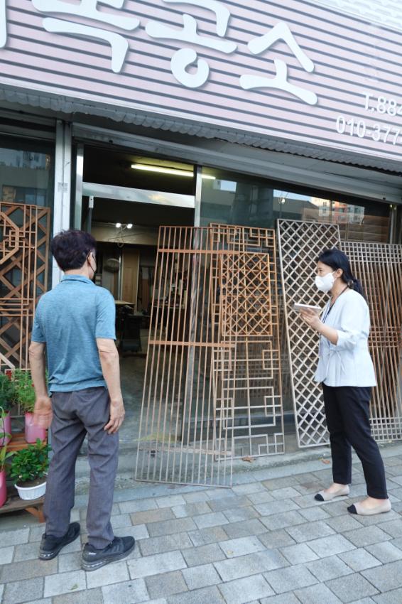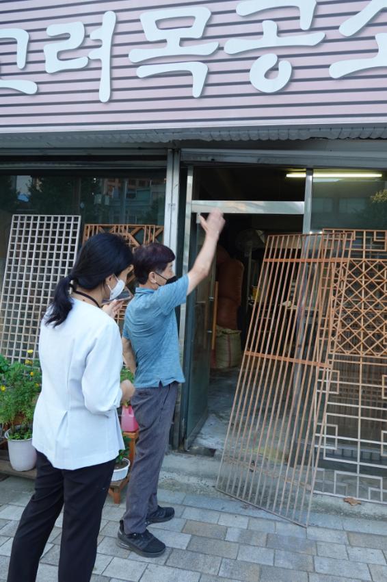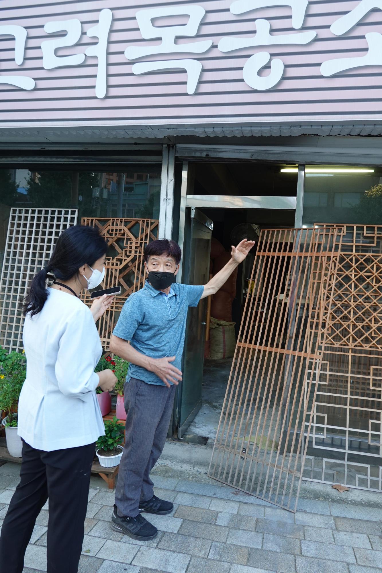 2022년 숭의목공예마을 기록을 위해 고려목공소 사장님을 사전면담을 하러 갔을 때 작업물을 설명하시는 모습을 촬영한 사진이다.