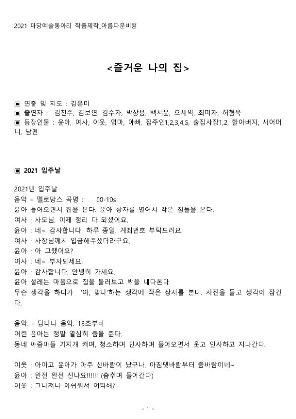 | 작품소개 | ‘우리에게 집이란 어떤 것인가?’에 대한 질문을 가지고 80년대 90년대 그리고 지금... 우리에게 이 마을, 이 집이 주는 의미가 무엇인지 생각하는 동네 사람들의 이야기를 담은 연극 |