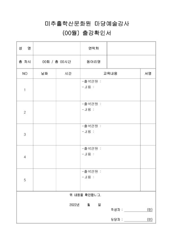 미추홀학산문화원 마당예술강사 출강확인서입니다.