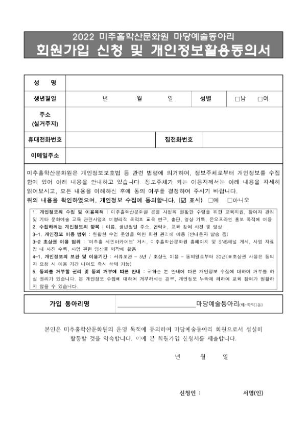 마당예술동아리 회원가입서