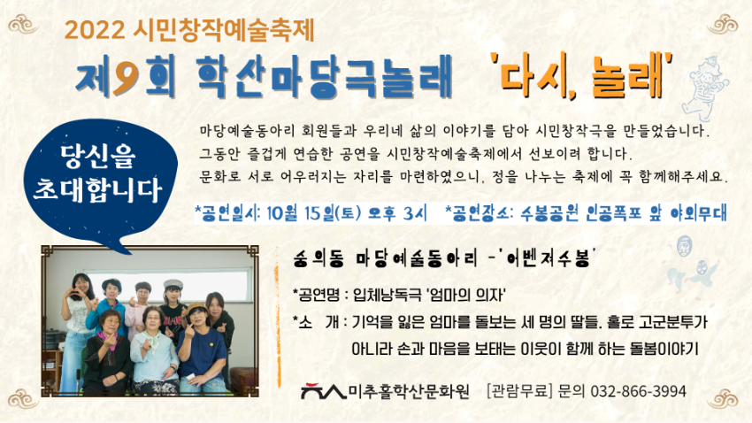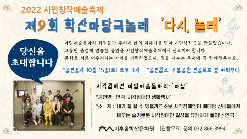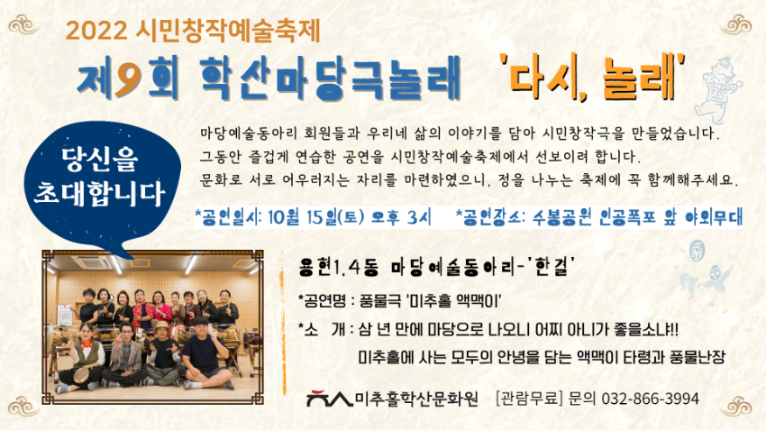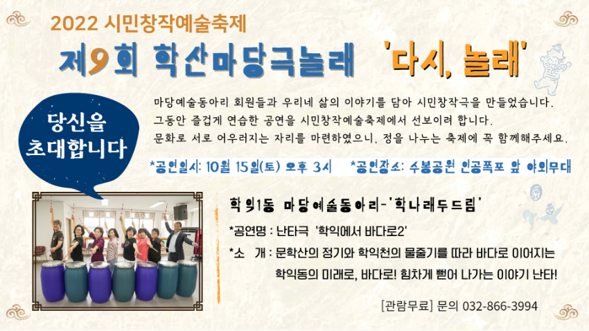 | 검색어 | 미추홀학산문화원,시민창작예술,마당예술동아리,초대장,학산마당극놀래,축제,공연,동아리,홍보 |