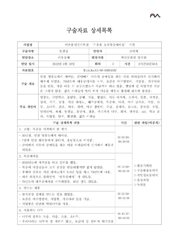 • 목    적 : 지역의 특색이 살아있는 숭의목공예마을에서 목공예의 일을 오랫동안 해 온 장인들의 구술로, 목공예의 변화상과 지역의 다양한 이야기들을 기록하고자 함.