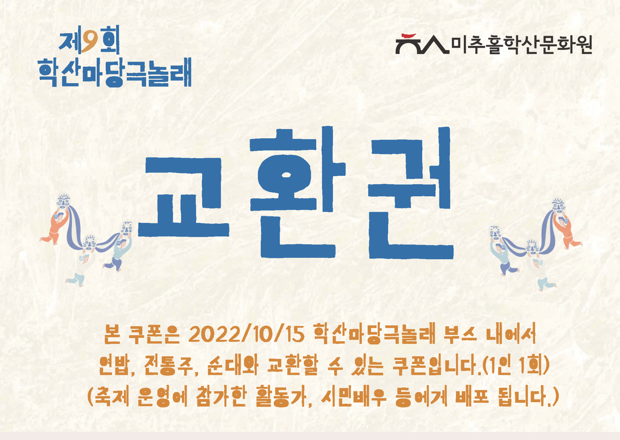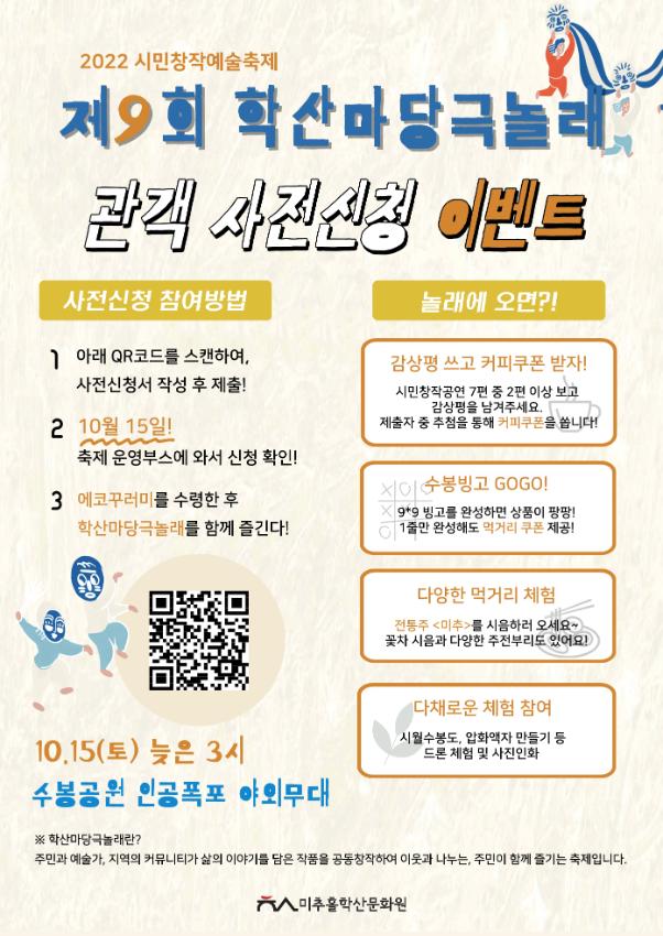 | 검색어 | 미추홀학산문화원,시민창작예술,마당예술동아리,학산마당극놀래,서포터즈,교환권,공연,축제 |
