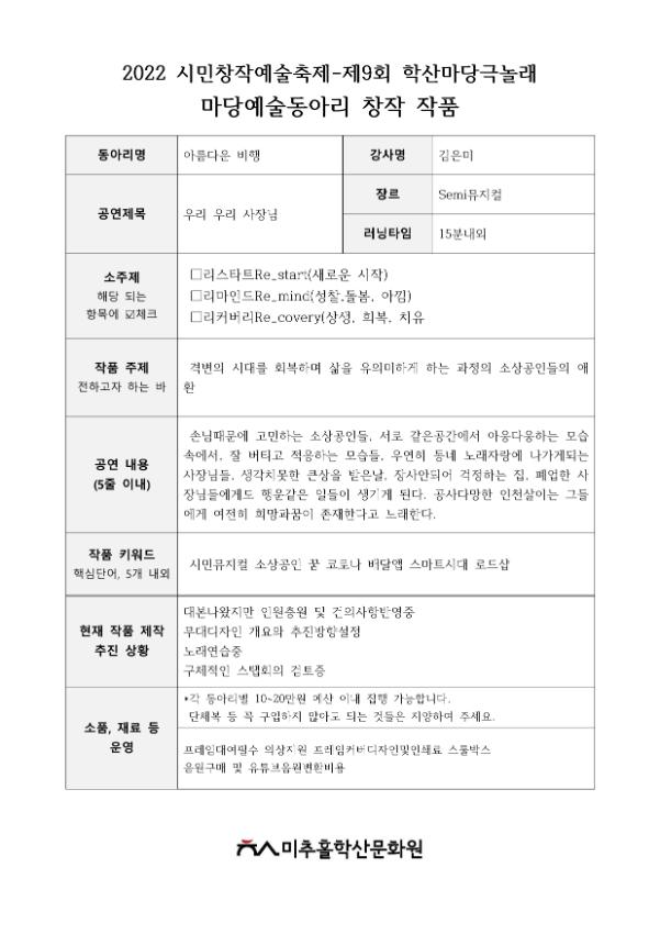 | 검색어 | 미추홀학산문화원,시민창작예술,마당예술동아리,마당예술강사,학산마당극놀래,강사회의,아다행,아름다운비행 |