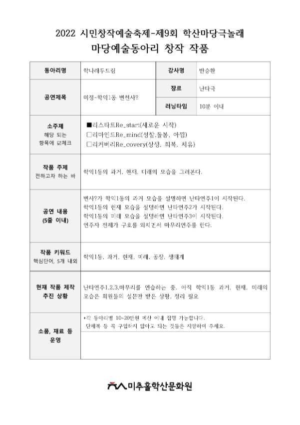 | 검색어 | 미추홀학산문화원,시민창작예술,마당예술동아리,마당예술강사,학산마당극놀래,강사회의,학나래,학나래두드림 |