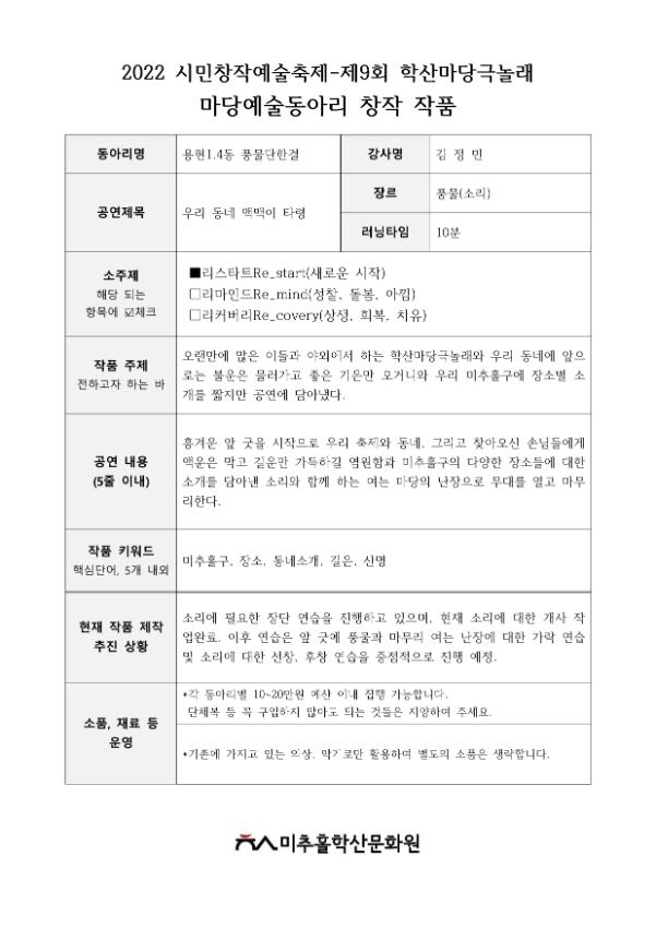 | 출처분류 | 미추홀학산문화원 사업 학산마당극놀래 2022 학산마당극놀래 |