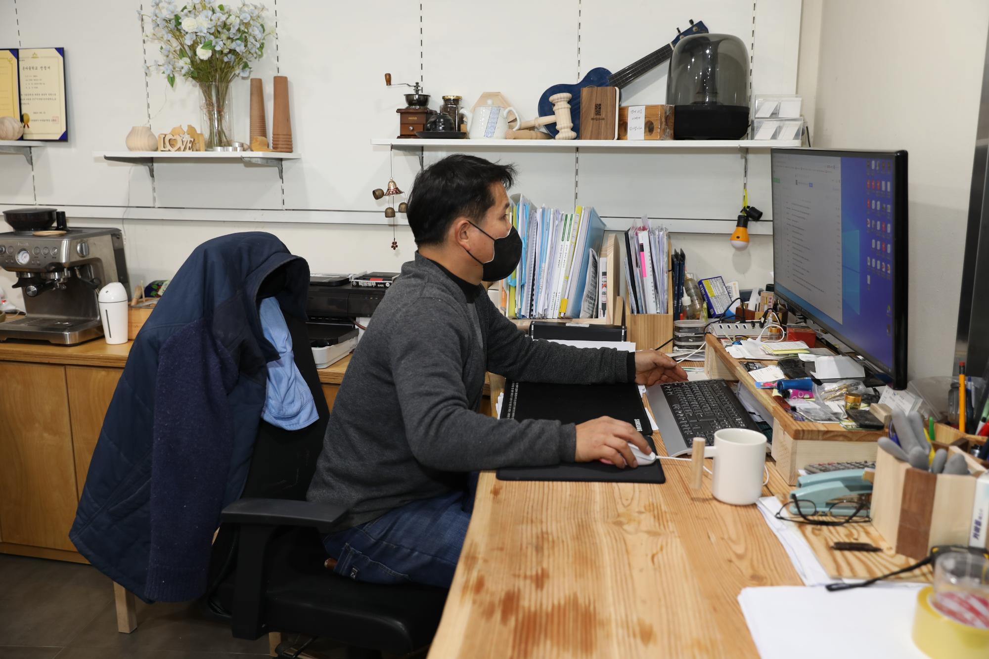2022년 숭의목공예마을 기록을 위해 숭의목공예센터를 방문했을 때 박승화 센터장님이 업무하시는 모습을 촬영한 사진이다.
