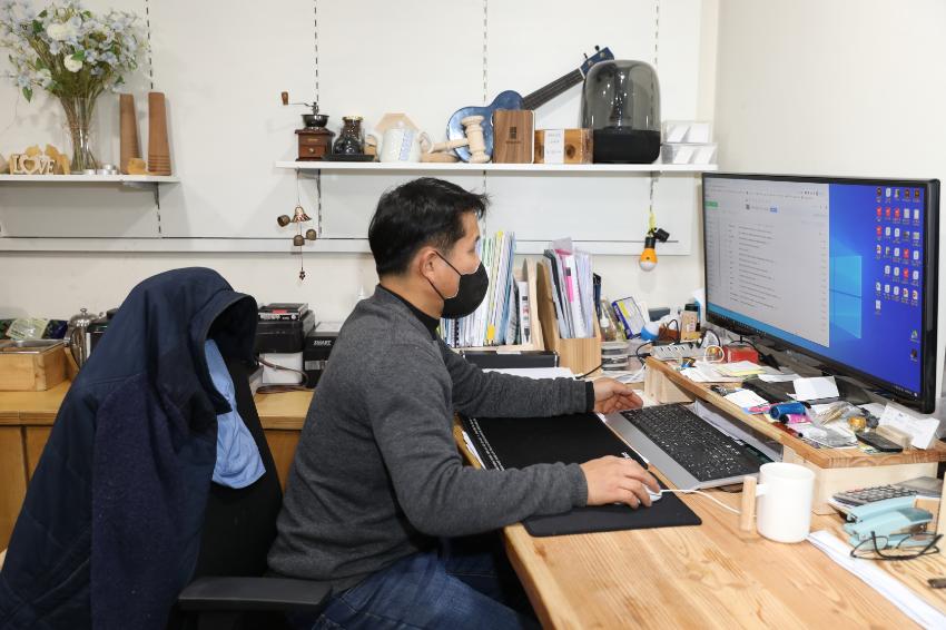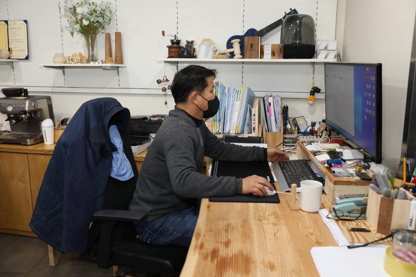 2022년 숭의목공예마을 기록을 위해 숭의목공예센터 박승화 센터장이 업무하는 모습을 촬영한 사진이다.