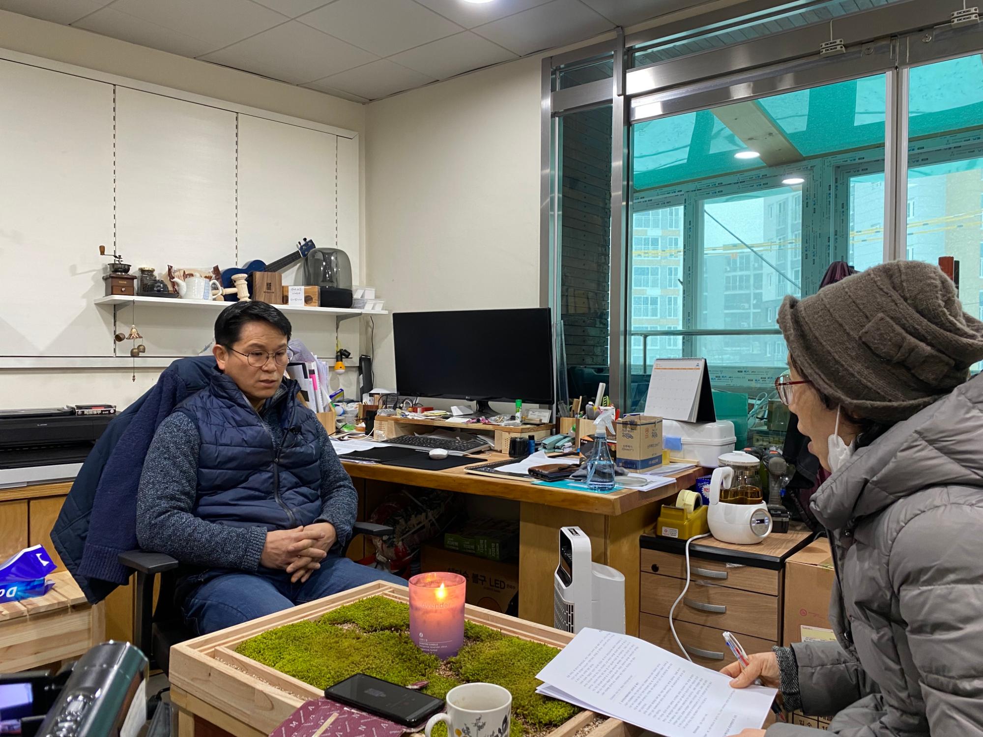 2022년 숭의목공예마을 기록을 위해 미추홀시민기록단 표기자님이 숭의목공예센터 박승화 센터장님을 인터뷰하는 모습이다.