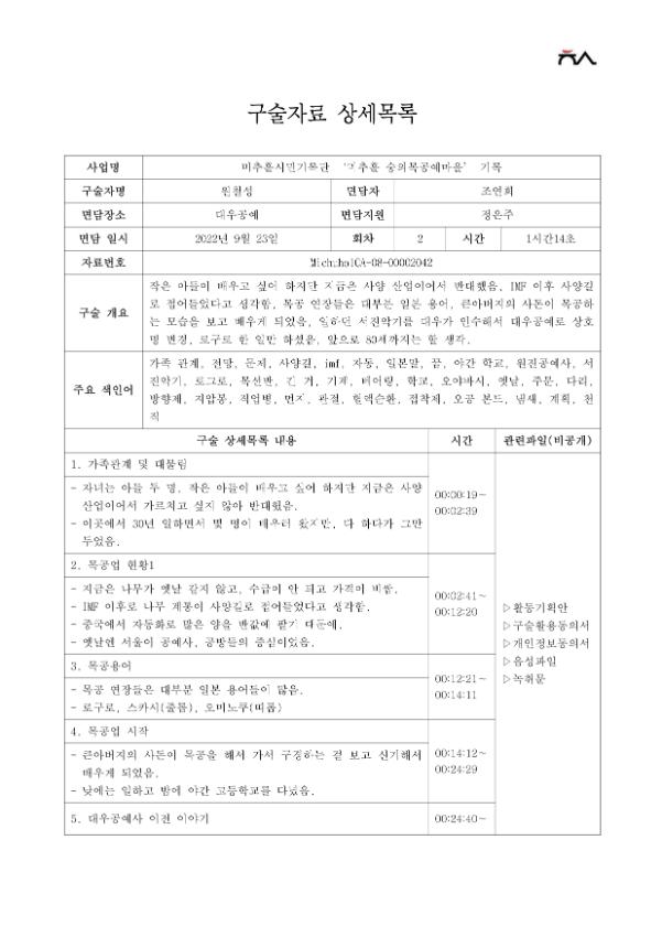 | 출처분류 | 미추홀학산문화원 사업 미추홀 기록 2022 시민기록단_목공장인 기록 인터뷰 대우공예 |
