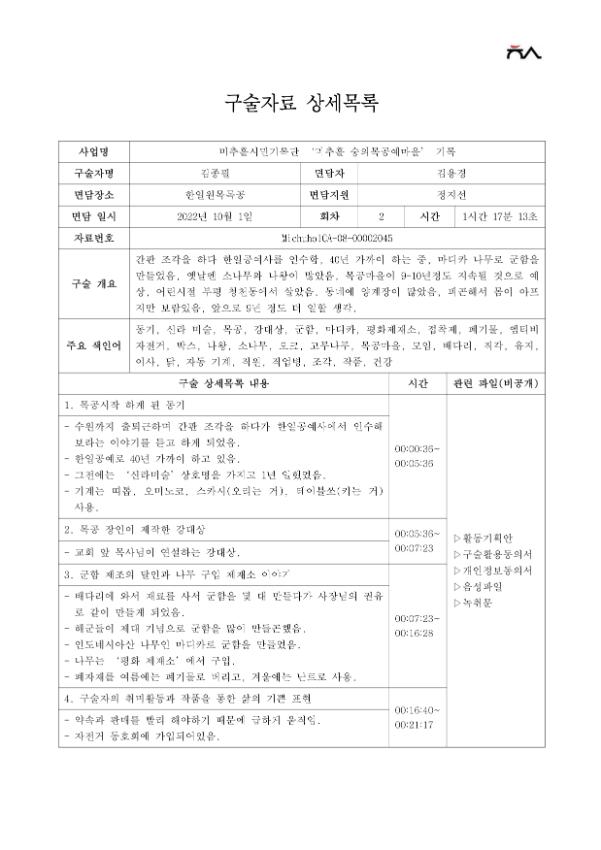 | 출처분류 | 미추홀학산문화원 사업 미추홀 기록 2022 시민기록단_목공장인 기록 인터뷰 한일원목목공 |