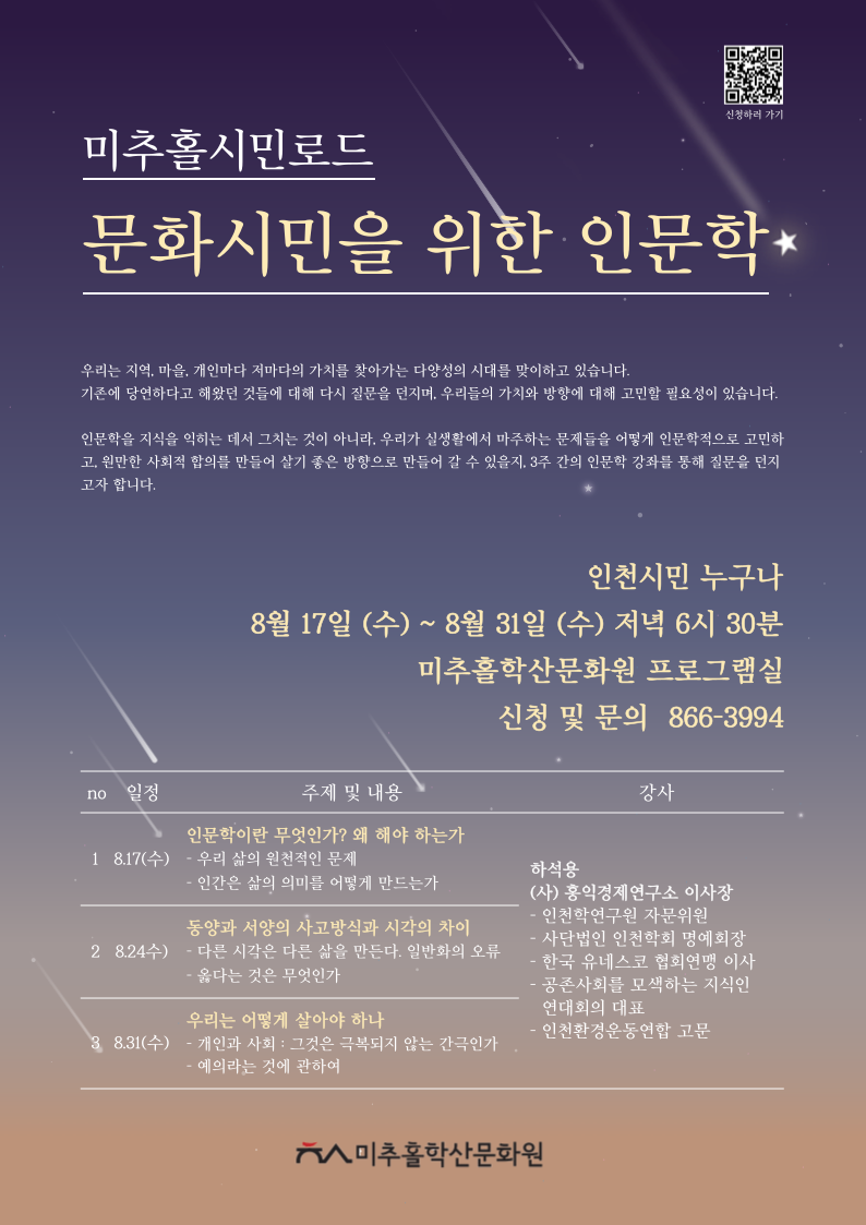 인문학은 지식을 익히는 데서 그치는 것이 아니라, 우리가 실생활에서 마주하는 문제들을 어떻게 인문학적으로 고민하고, 원만한 사회적 합의를 만들어 살기 좋은 방향으로 만들어 갈 수 있을지, 3주 간의 인문학 강좌를 통해 질문을 던지고자 합니다.
