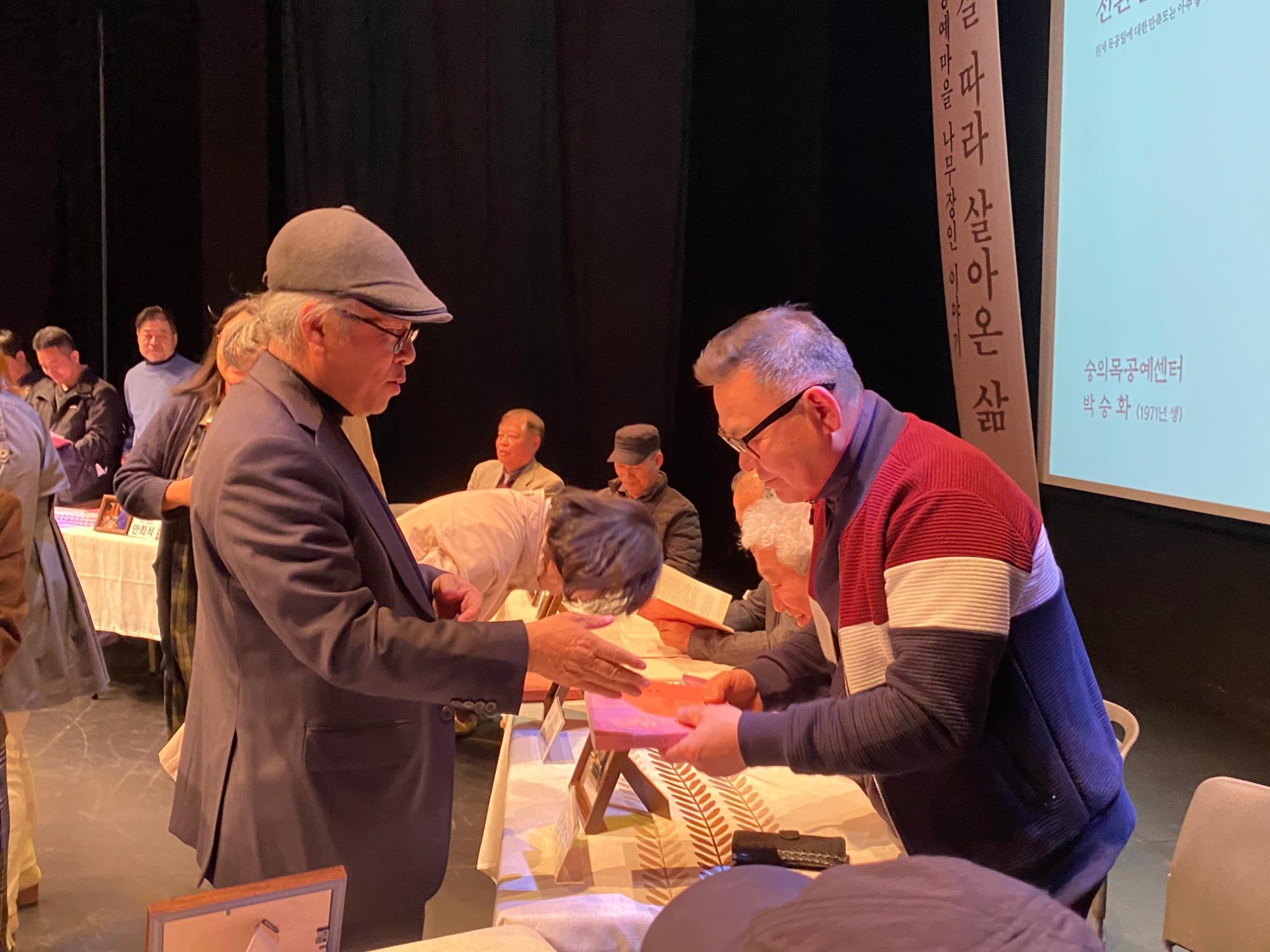 \r\n한일원목목공 김종필 사장님께 시민기록단 김용경님이 책을 전달하는 모습이다