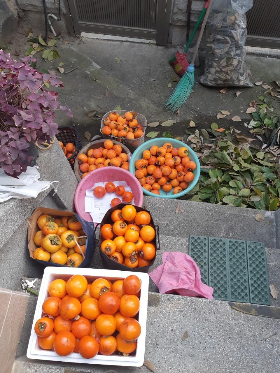 2002년 친정 아버지의 병환이 깊어졌다. 엄마도 연세가 많으니 걱정되었다. 그런던 참에 친정집 바로 옆 집이 매물로 나와서 구입하였다. 이사하는 날 마당의 감나무 2그루가 우리 식구를 맞아 주었다. 두아이와 함께 큰 감나무는 매해 가을에 홍시와 단감을 생산했다. 재개발로 집을 비우게 되어 2021년 마지막 수확을 하면서 고맙다! 작별 인사를 했다.