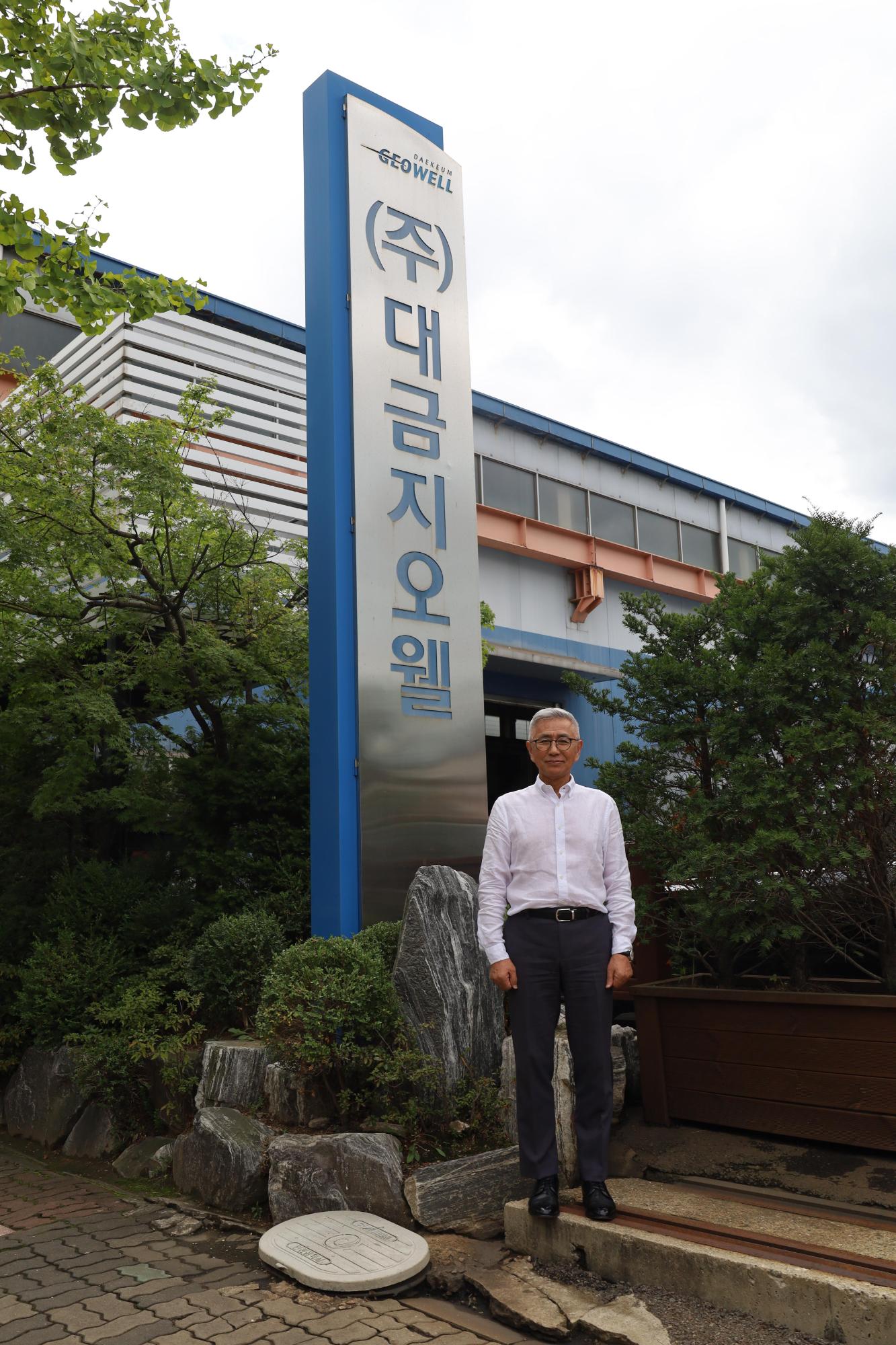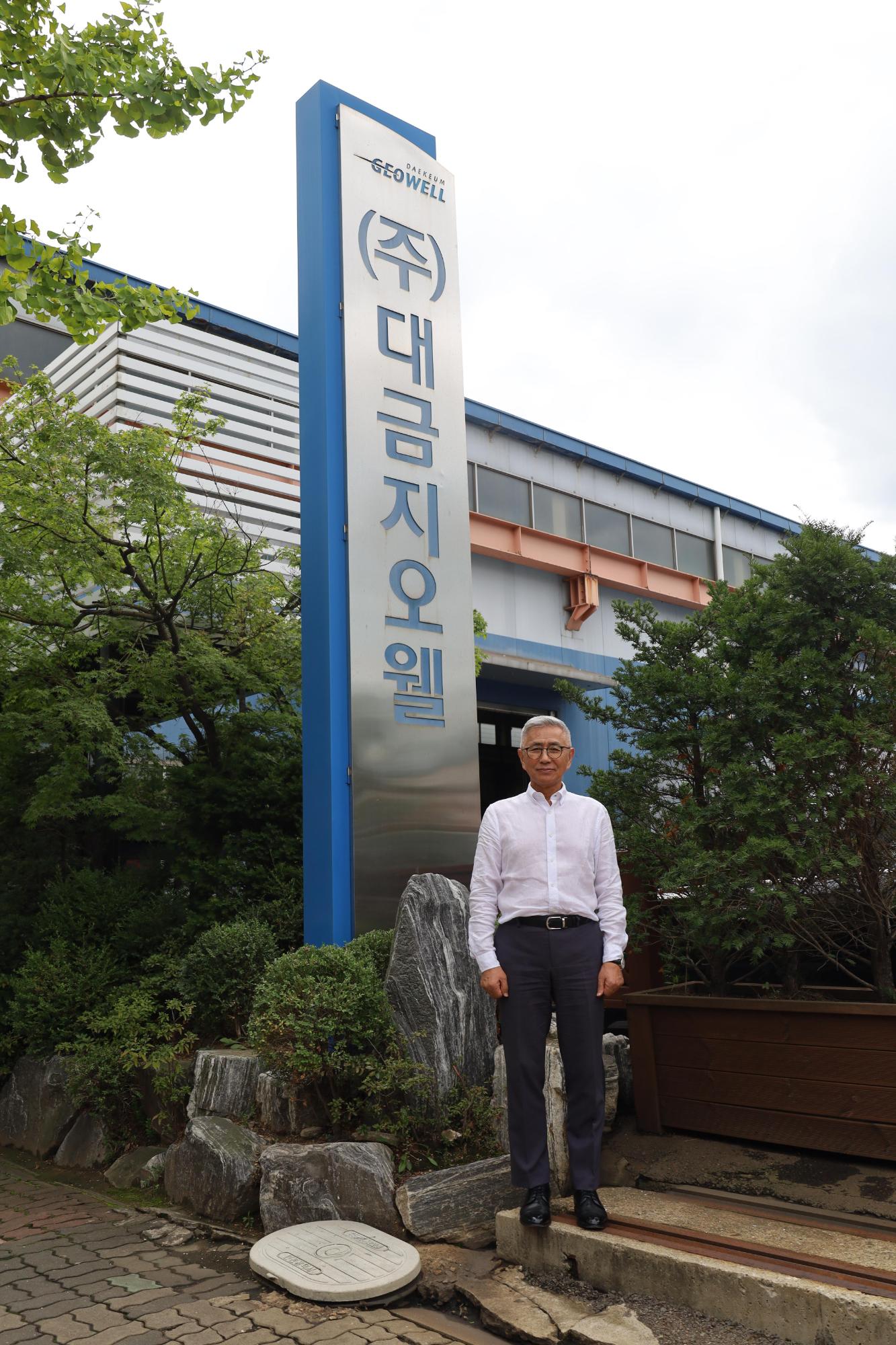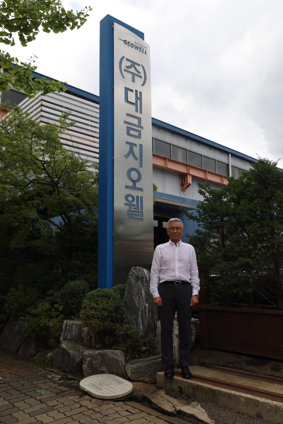 대금지오웰 이승우 사장과의 인터뷰 후 공장 입구와 입간판 앞에서 촬영한 기념사진이다.