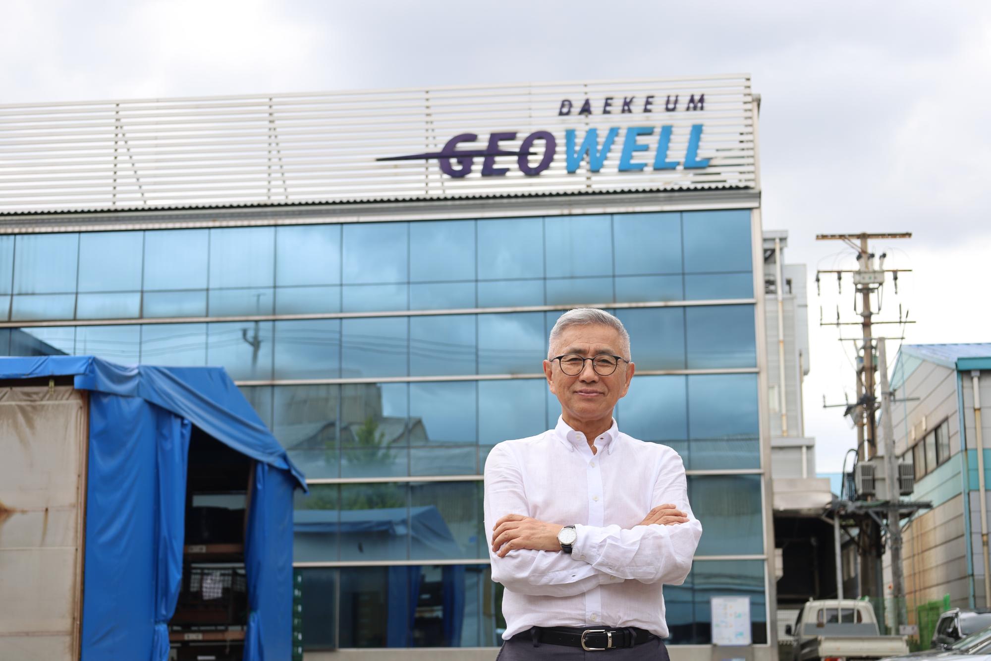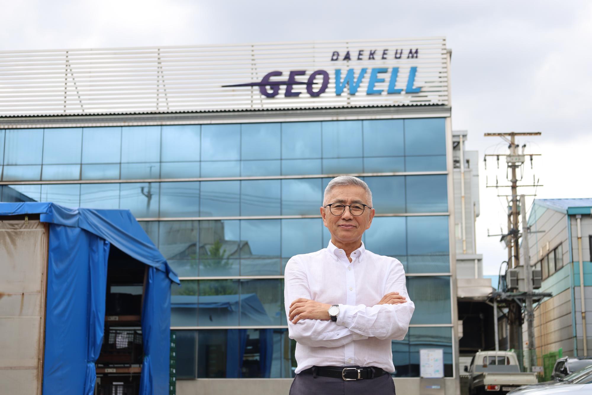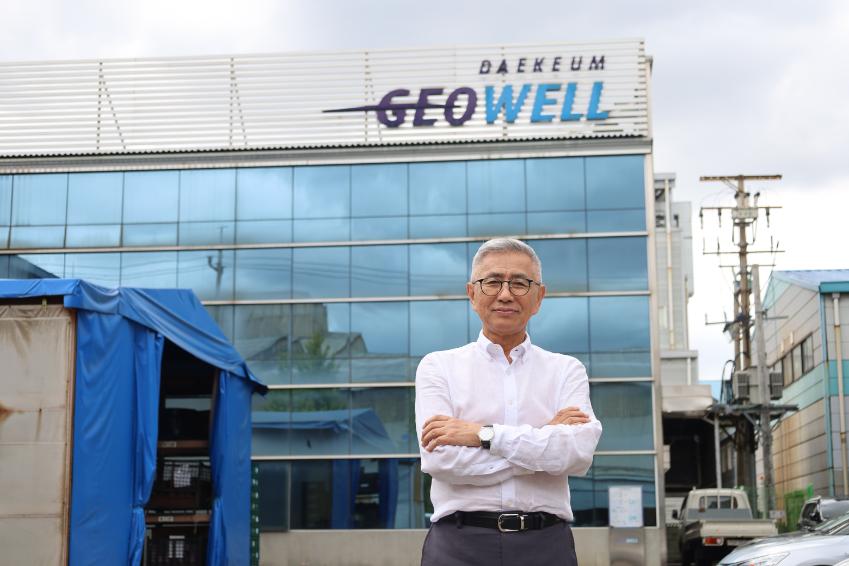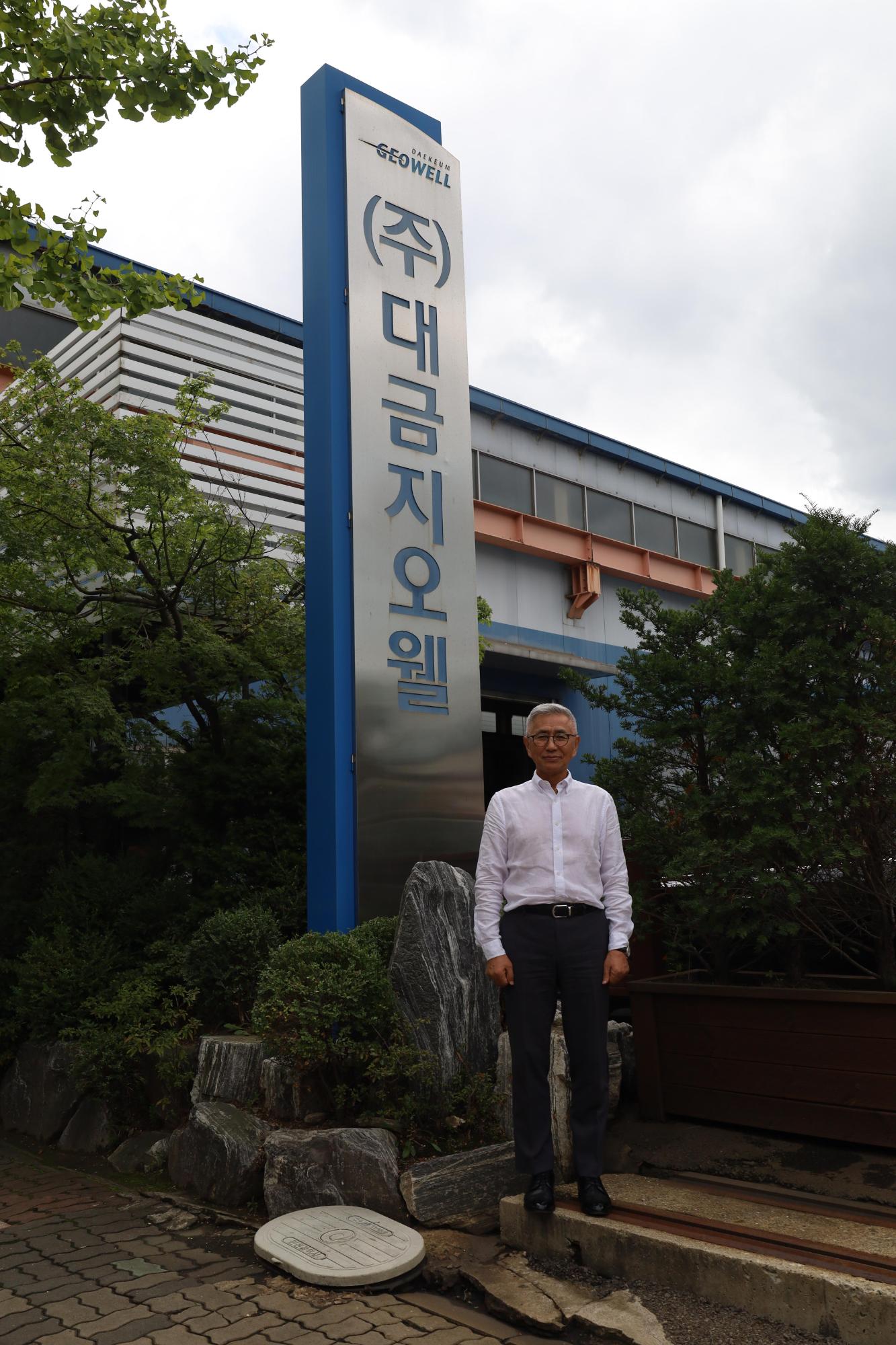 대금지오웰 이승우 사장과의 인터뷰 후 공장 입구와 입간판 앞에서 촬영한 기념사진이다.