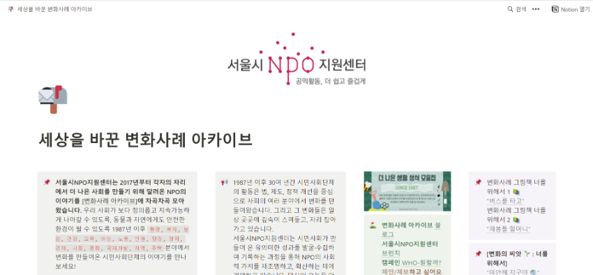 🔸 서울시NPO지원센터 변화사례 아카이브 | 서울시NPO지원센터 1987년 이후 30여 년간 시민사회단체의 활동은 법, 제도, 정책 개선을 중심으로 사회의 여러 분야에서 변화를 만들어왔습니다. 그리고 그 변화들은 일상 곳곳에 깊숙이 스며들고, 자리 잡아가고 있습니다. 서울시NPO지원센터는 시민사회가 만들어 온 유의미한 성과를 발굴·수집하여 기록하는 과정을 통해 NPO의 사회적 가치를 재조명하고, 확산하는 데에 기여하고 있습니다. 당신의 오늘을 안전하고 건강한 하루로 만들어 준 누군가의 시간과 노력이 궁금하다면, 앞으로 나와 사회를 더 나은 방향으로 변화시키는 방법을 찾고 싶은 당신이라면 변화사례 아카이브를 주목해 주세요!