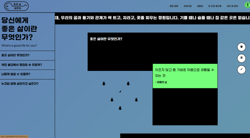 🔸 좋은 삶 질문집 지원주택 당사자 생애서사 아카이브 | 씨닷, SH 이 아카이브는 C.(씨닷)과 SH서울주택도시공사가 함께한 <지원주택 당사자 참여서사 연구 및 디지털 아카이빙 연구> 보고서 인사이트를 공유하기 위해 만들어졌습니다. 2020년 11월부터 2021년 8월까지, 9개월 간 진행된 지원주택 당사자 참여서사 연구 및 디지털 아카이빙 연구(이하 지원주택 당사자 연구)는 지원주택이 필요한 주거약자 15명의 생애 이야기를 분석하고, 이중 10명의 이야기를 영상으로 기록한 질적 연구입니다. 이 연구에서는 주거를 ‘좋은 삶’을 위해 가장 기본적으로 보장되어야 할 권리로 바라보고 이를 위한 사회적 안전망은 어떤 모습이어야 하는지 고민했습니다. 나아가 개인의 취약성에 대한 낙인, 차별, 혐오, 배제와 같은 사회문제를 유발하는 구조를 시스템 사고로 분석하며 모두가 지역사회에서 자립하여 함께 살아가기 위한 방향성을 제안하고자 합니다.