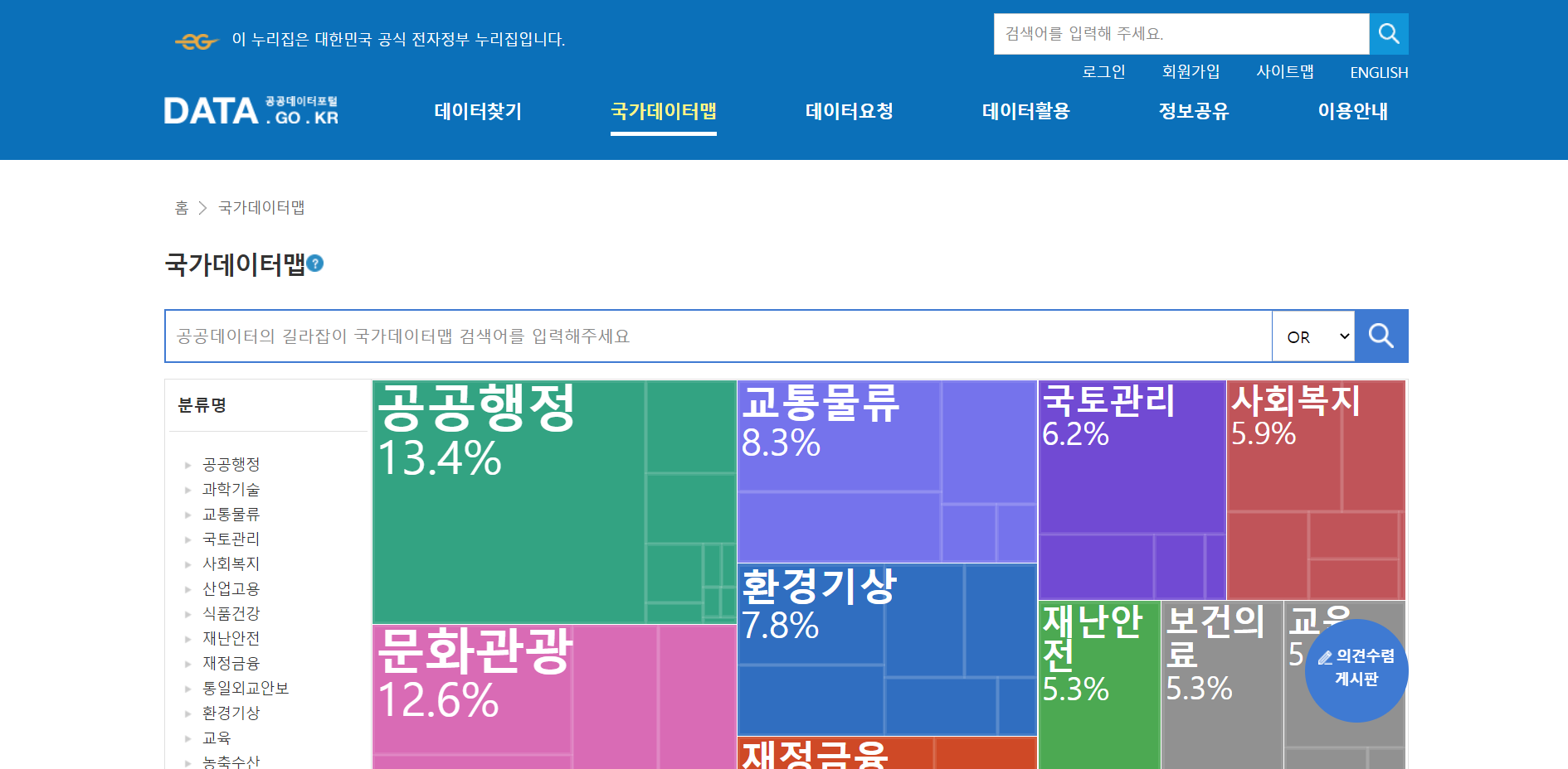 공공데이터포털은 이렇게 모은 데이터들을 공공행정, 문화관광, 산업고용 등의 16개의 대주제로 분류한 ‘국가데이터맵’의 형태로도 제공하고 있으며, ‘공공데이터 시각화’ ,‘위치정보 시각화’ 등의 콘텐츠로도 활용하고 있습니다."
