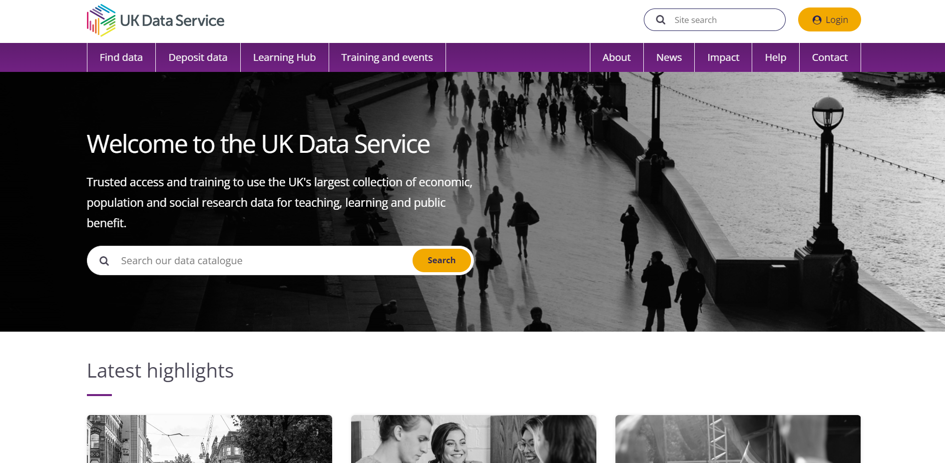 "UKRI(UK Research and Innovation)가 자금을 지원하는 이 서비스는 영국 데이터 아카이브(UK Data Archive), 경제·사회 데이터 서비스(Economic and Social Data Service), 안전한 데이터 서비스(Secure Data Service), 인구조사 프로그램(Census Programme), 설문조사 문제은행(Survey Question Bank)을 포함하여 수십 년 동안 영국의 연구 인프라에 대한 '경제사회연구회(Economic and Social Research Council, ESRC)'의 투자를 통합하고 구축합니다. 이러한 토대 위에 우리는 영국에서 가장 큰 경제, 사회 및 인구 데이터 컬렉션을 계속 보관하고 있습니다."
