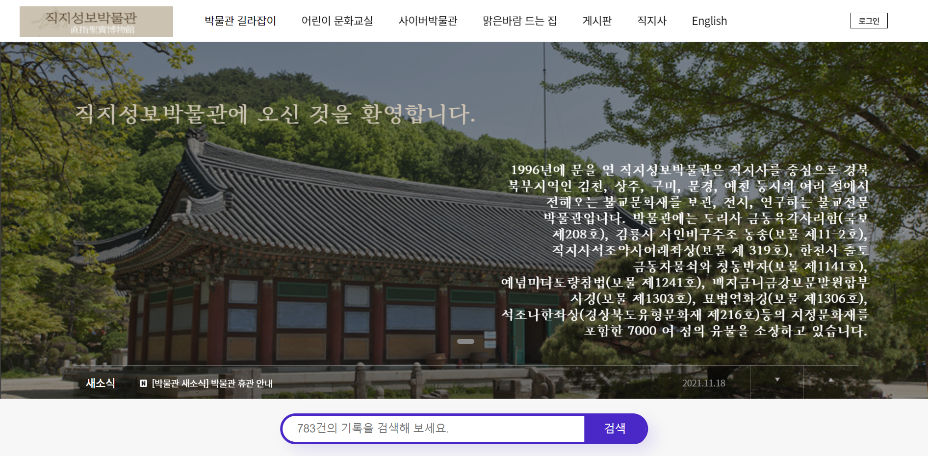 "1996년에 문을 연 직지성보박물관은 직지사를 중심으로 경북 북부지역인 김천, 상주, 구미, 문경, 예천 등지의 여러 절에서 전해오는 불교문화재를 보관, 전시, 연구하는 불교전문 박물관입니다.