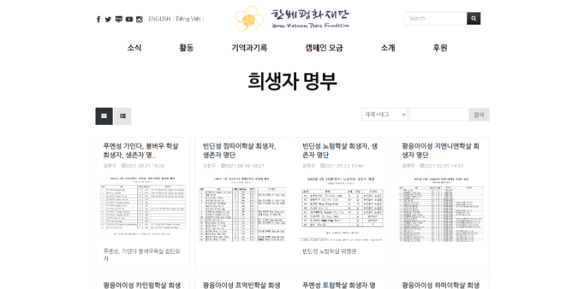 한베평화재단은 홈페이지에 '기억과 기록' 항목을 개설하여 전쟁 피해자들의 증언 구술, 베트남 전쟁 위령비 사진, 각종 문헌기록과 희생자 명부 기록을 서비스하고 있습니다.
