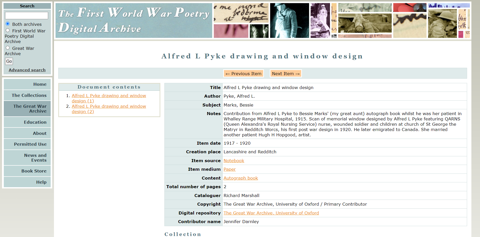 2008년에 시작된 '1차 세계 대전 시 디지털 아카이브(옥스퍼드 대학교 기반)'는 1차 세계 대전 문학과 관련된 자료를 일반 대중에게 제공합니다. 이 아카이브는 옥스퍼드의 성공적인 멀티미디어 디지털 아카이브와 프로젝트를 바탕으로 구축되었으며, 다양한 주요 영국 시인들의 이미지, 텍스트, 오디오, 비디오 등을 포함하고 있습니다.