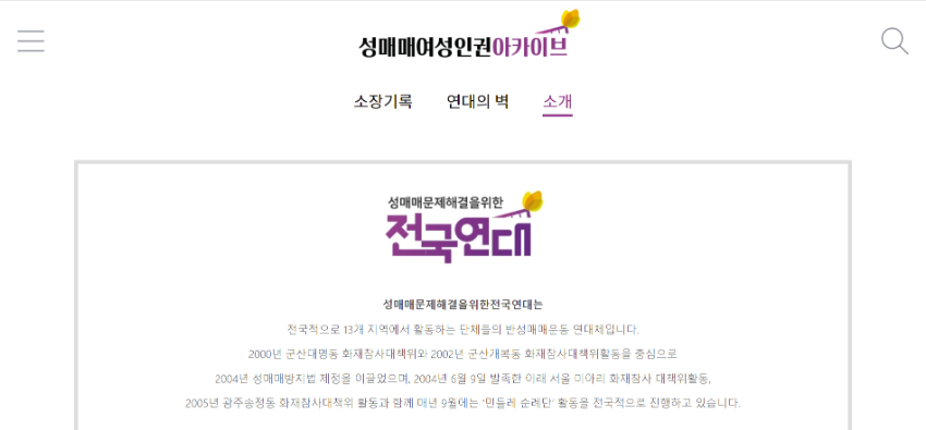 "성매매여성인권아카이브는 한국 사회가 성매매를 다루어 온 역사와 성매매여성 인권의 위치를 조명하고자 합니다. 2000년, 2002년 군산 성매매 업소에서 연달아 발생한 화재로 19명의 여성이 목숨을 잃었습니다. 그러나 20여 년이 지난 지금도 성매매여성의 인권은 전혀 달라지지 않았습니다.