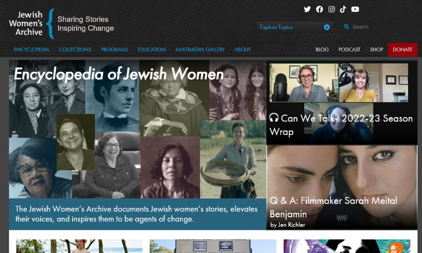 "The Jewish Women's Archive는 유태인 여성의 특별한 이야기를 수집하고 홍보하는 데 전념하는 국제 조직입니다. JWA는 우리 시대의 시급한 문제를 이해하기 위한 틀로써 과거를 탐구합니다. 놀라운 역할 모델로 젊은이들에게 영감을 줍니다. 그리고 유대인 여성의 이야기를 사용하여 사람들이 자신을 변화의 주체로 보도록 자극합니다.