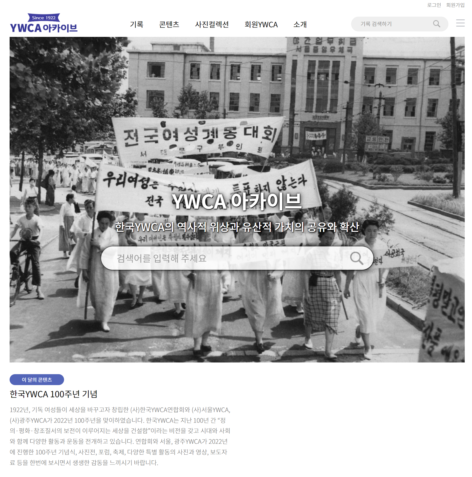 "YWCA아카이브는 1922년에 설립된 한국YWCA연합회가 100주년을 앞두고 시민운동 과정에서 생산하고 보관해온 기록들을 사회와 공유하기 위해 구축한 기록물 공유 공간입니다.
