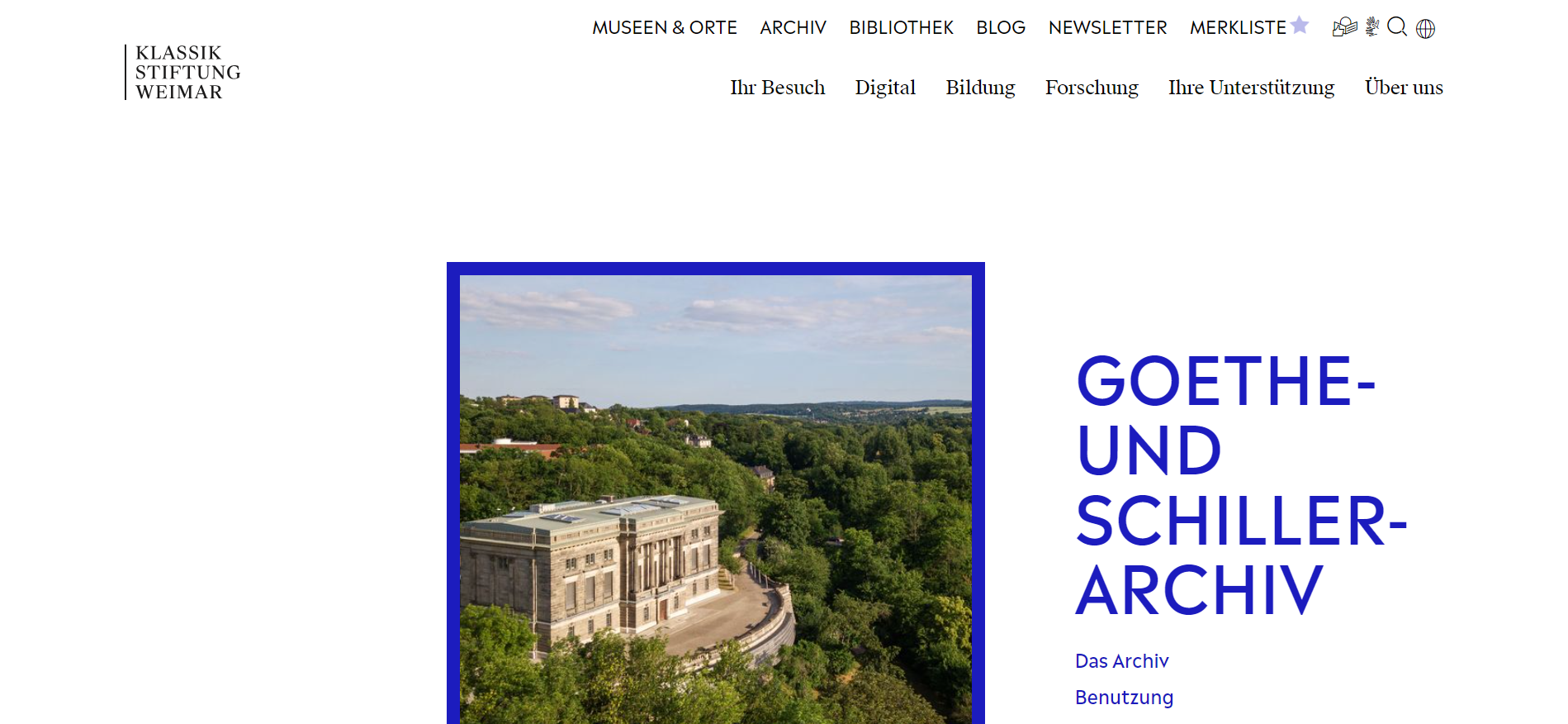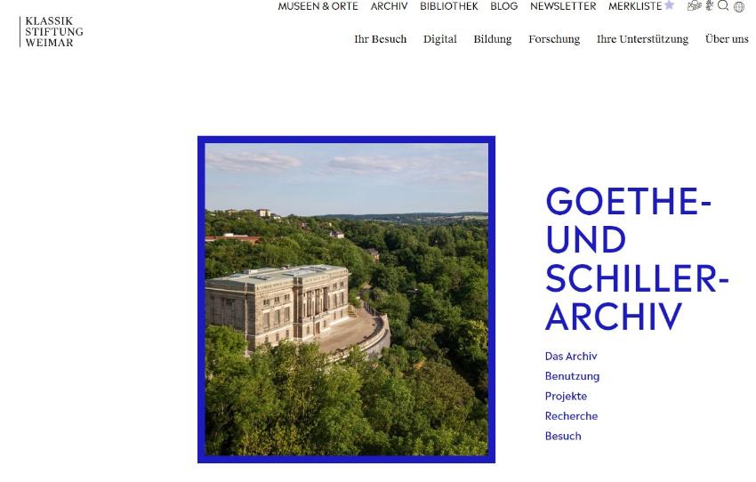“바이마르의 괴테와 쉴러 기록 보관소(GOETHE- UND SCHILLER-ARCHIV)는 독일에서 가장 오래된 문학 기록 보관소입니다. 이 아카이브에는 작가, 학자, 철학자, 작곡가 및 시각 예술가의 150개 이상의 논문과 출판사, 클럽 및 문학 협회(괴테 협회, 인젤 출판사 라이프치히, 독일 쉴러 재단 및 일반 독일 음악 협회 포함)의 14개 아카이브가 저장되어 있습니다. 13세기 말부터 21세기 초까지 약 3,000명의 인물이 남긴 개별 사본도 있습니다. 이들은 18세기와 19세기에 초점을 맞춰 독일어 문학, 음악, 미술, 과학을 포괄적으로 대표합니다.