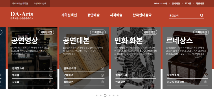 한국예술디지털아카이브(Korea Digital Archives for the Arts : DA-Arts)는 2011년 예술자료를 시간ㆍ공간의 제약을 넘어 활용할 수 있도록 하고자 소장 예술자료 중 일부를 디지털화하여 제공하면서 시작되었습니다.