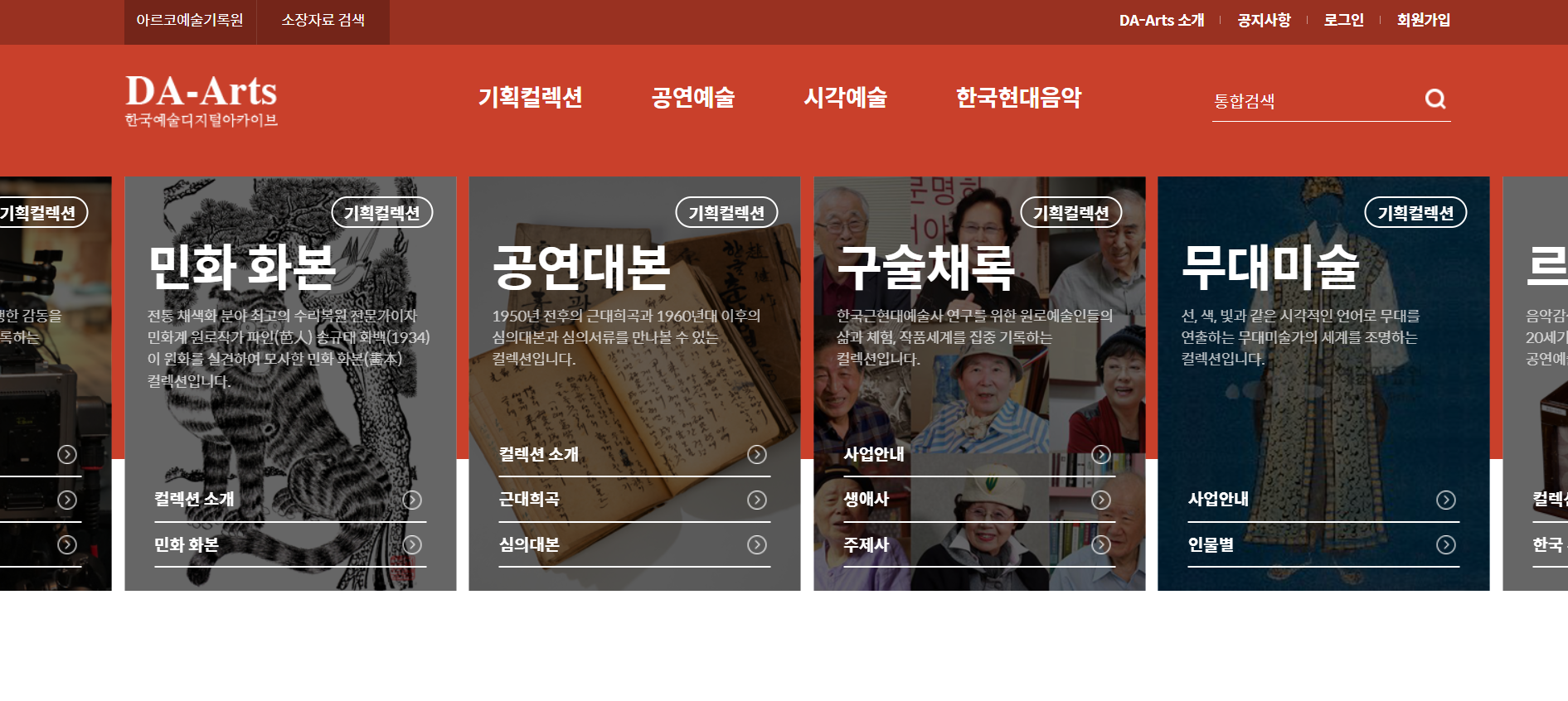 또한 소장자료를 활용한 다양하고 차별화된 기획컬렉션(구술채록, 무대미술, 민화화본, 공연대본, 공연영상 등)을 구축하여 한국예술디지털아카이브(DA-Arts)를 통해 양질의 이용자 서비스를 제공하고 있습니다.