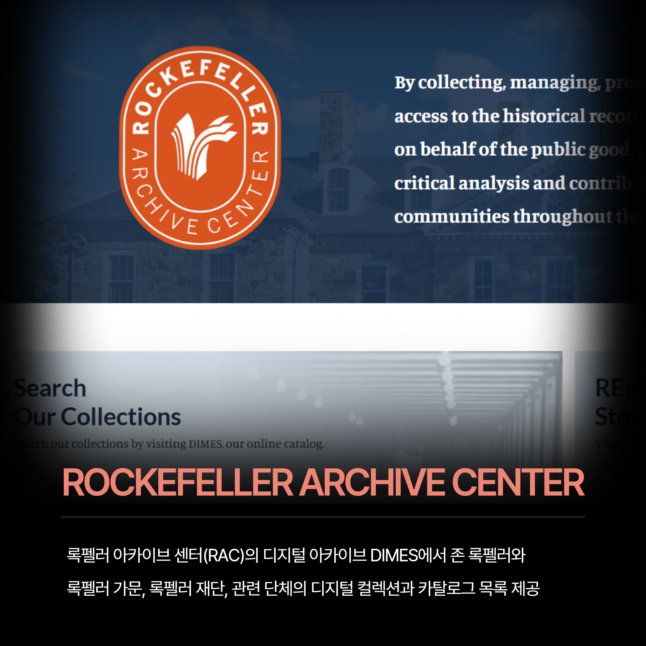 록펠러 아카이브 센터(RAC)는 존 D. 록펠러 주니어의 자녀들이 가족의 자선 활동 기록을 한 기관에 모으고 이러한 자선 활동이 국가와 세계에 어떤 영향을 미쳤는지에 대한 연구를 자극하기 위해 노력한 결과로 1974년에 설립된 아카이브입니다. 록펠러 아카이브 센터와 연결된 디지털 아카이브 DIMES 에서는 록펠러 아카이브 센터에서 보유한 록펠러 가문, 록펠러 재단, 관련 단체의 디지털 컬렉션과 카탈로그 목록을 제공하며 문서, 사진, 미디어에 접근할 수 있습니다.