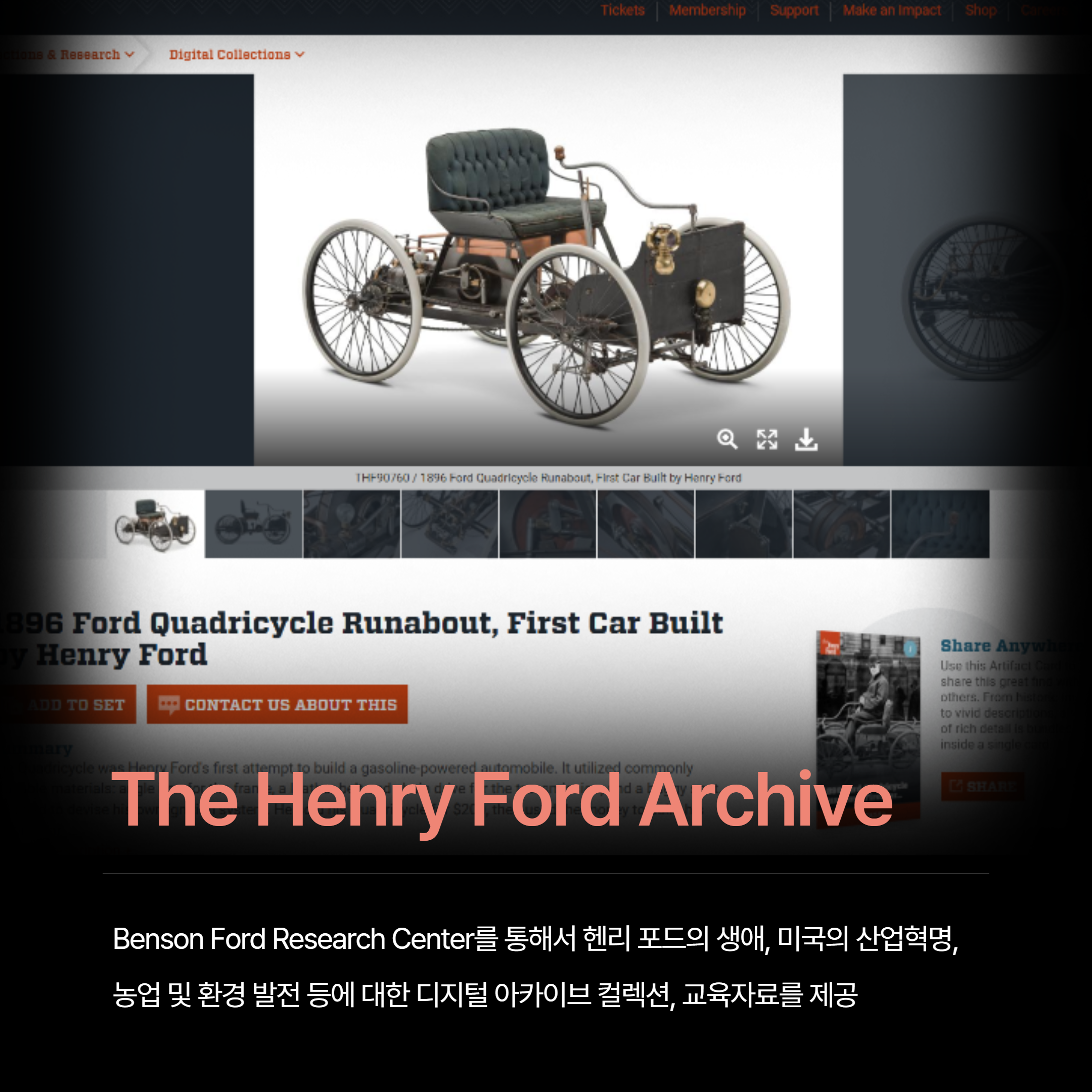 The Henry Ford Archive of American Innovation™은 Benson Ford Research Center를 통해서 헨리 포드의 생애, 미국의 산업혁명, 농업 및 환경 발전 등에 대한 디지털 아카이브 컬렉션을 제공합니다. 연구자 뿐만 아니라 학생과 대중을 위한 교육 자료도 제공합니다.
