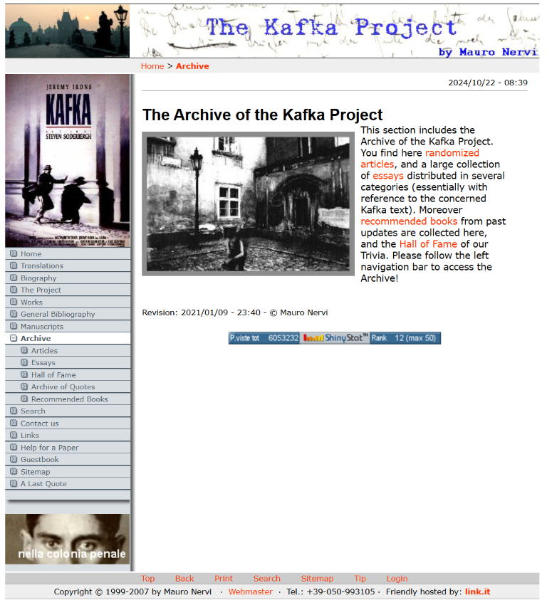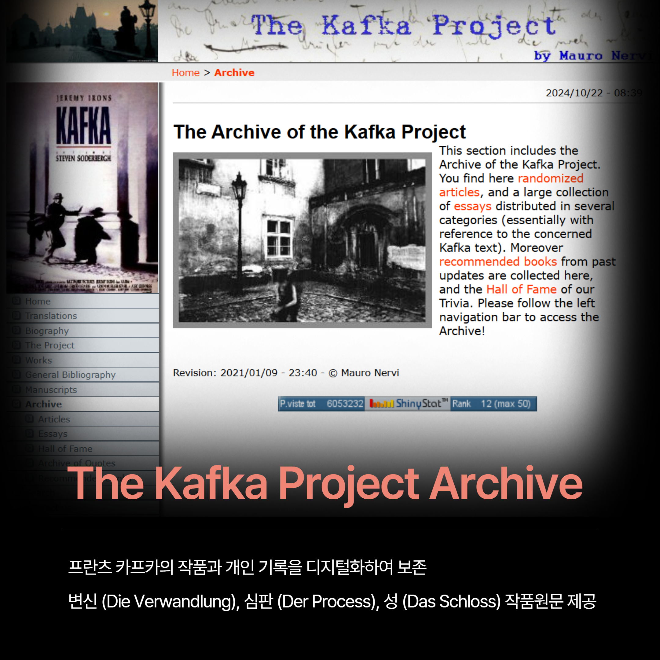 Kafka Project는 프란츠 카프카의 작품과 개인 기록을 디지털화하여 보존한 디지털 아카이브입니다. 카프카의 대표작인 "변신 (Die Verwandlung)", "심판 (Der Process)", "성 (Das Schloss)" 등의 독창적인 작품들을 원문으로 만나볼 수 있으며, 그의 삶과 문학적 배경을 깊이 이해할 수 있는 다양한 개인 기록들을 제공합니다. Kafka Project는 디지털 시대에 카프카의 문학을 전 세계에 확산시키고, 독자들에게 보다 풍부한 문학적 경험을 선사하는 중요한 아카이브입니다.