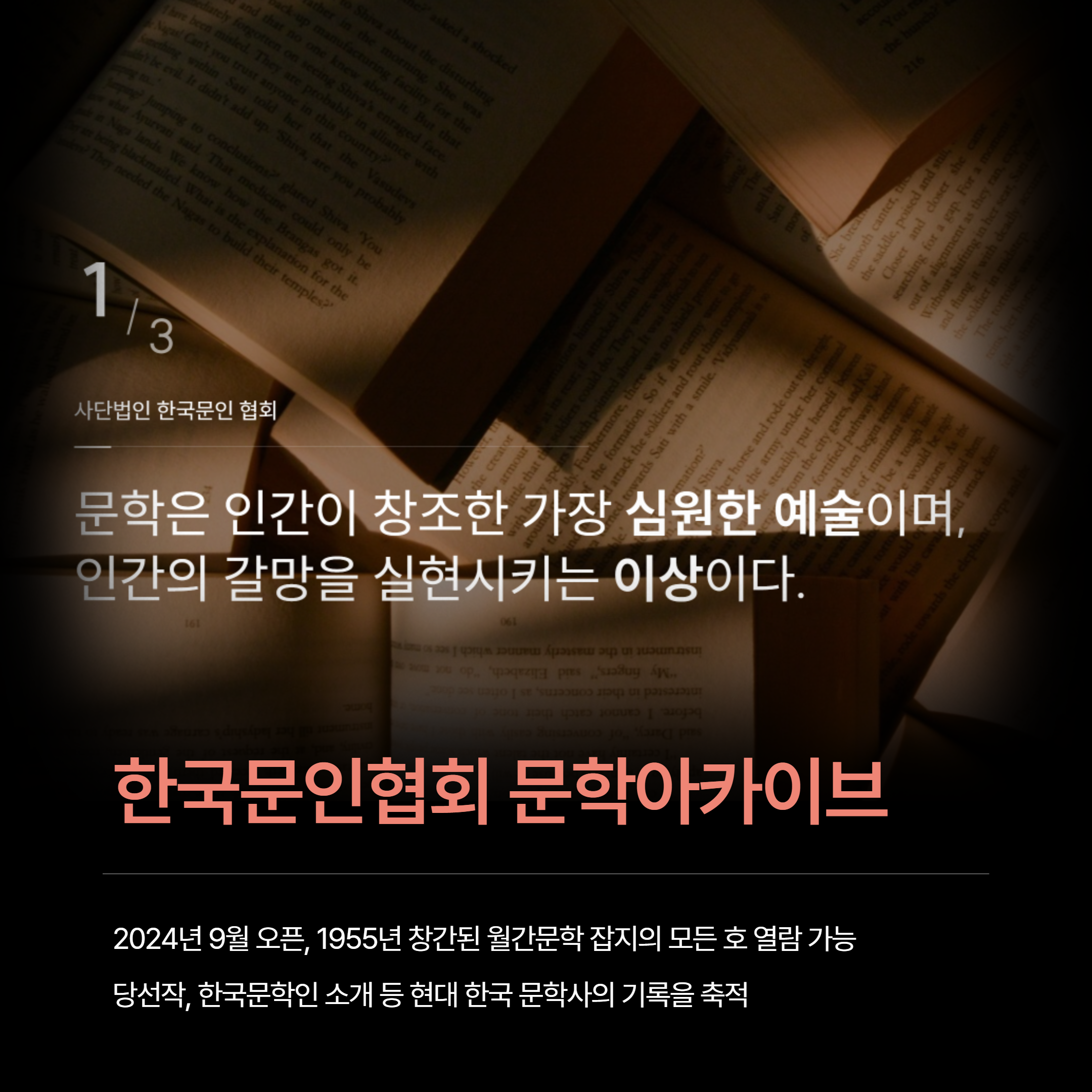 이제 문학은 종이책 속에서 머무르는 것이 아니라 디지털 환경에서 사람들과 연결됩니다. 문학 아카이브는 과거와 현재를 잇는 다리이자, 새로운 세대가 감성을 지속적으로 발견하고 공감할 수 있는 통로입니다. 0과 1 사이에서 다시 발견하는 문학 아카이브를 소개합니다.