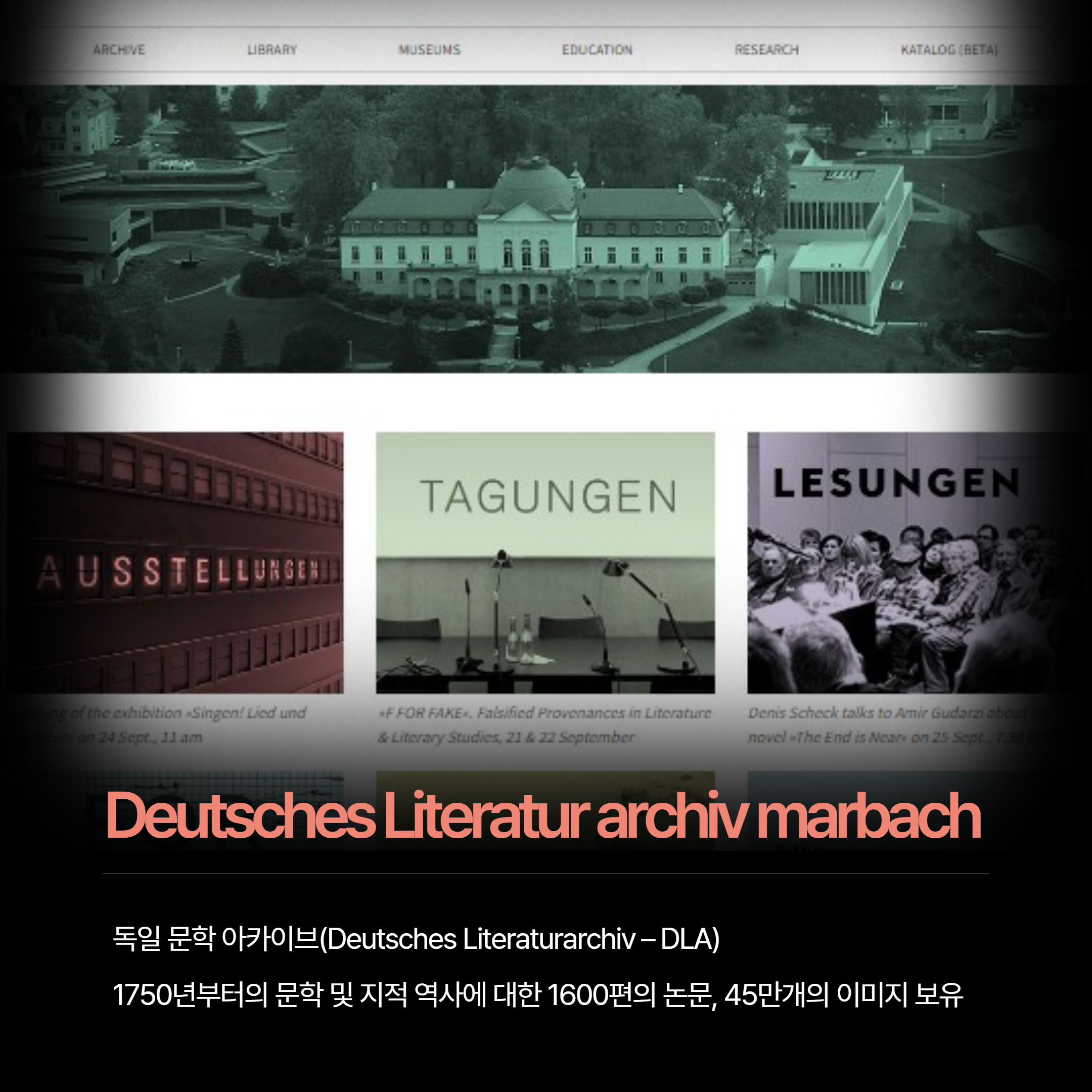 "독일 문학 아카이브(Deutsches Literaturarchiv – DLA)는 세계에서 가장 중요한 문학 기관 중 하나입니다. 이 컬렉션은 1750년부터 현재까지의 문학 및 지적 역사에 대한 귀중한 자료를 풍부하게 모아 보존하고 있습니다. 1955년 설립 이후 문학, 교육 , 연구 활동을 펼쳐왔습니다. 컬렉션은 자료 비평을 수행하는 모든 사람에게 열려 있습니다. 1,600편의 논문과 컬렉션, 문학 출판사의 아카이브, 450,000개 이상의 이미지와 물건을 보유한 독일 문학 아카이브는 동종 분야의 선도적인 기관 중 하나입니다. 현대 독일 문학의 가장 큰 특별 컬렉션으로, 160명 이상의 작가와 수집가가 소장한 도서관과 함께 150만건 이상의 기록물(도서, 정기 간행물, 아날로그 및 디지털 텍스트, 음향 및 시각 미디어)을 포함하고 있습니다.