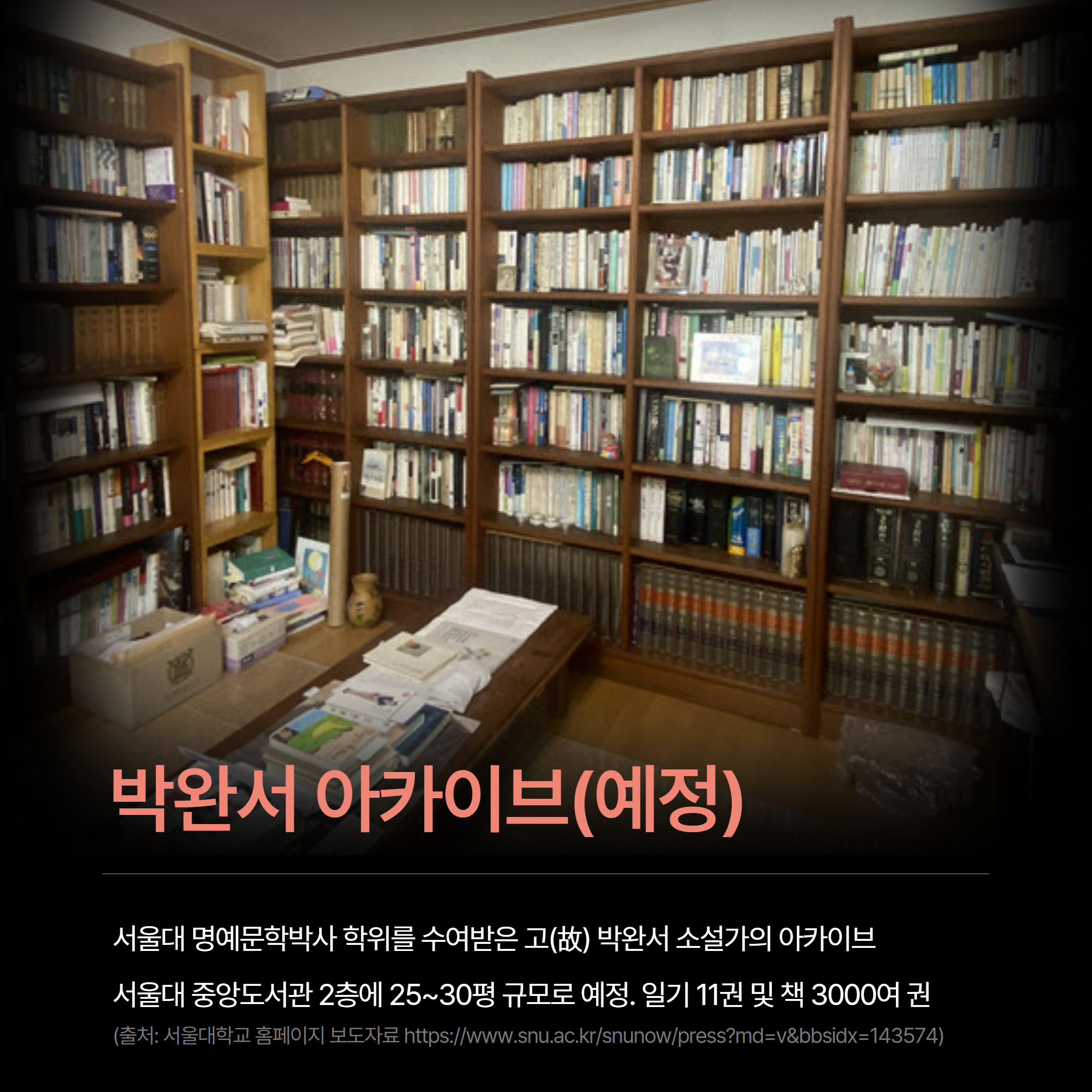 서울대 명예문학박사 학위를 수여받은 고(故) 박완서 소설가의 아카이브입니다. 보도자료에 의하면, 서울대 중앙도서관 2층에 25~30평 규모로 박완서 소설가의 구리시 아치울 노란집 서재를 재현할 계획입니다. 2023년 9월 협약을 맺고 아카이브를 준비중이며 일기 11권 및 책 3000여 권을 아카이브에서 전시 예정입니다.