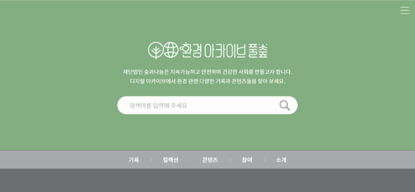 환경아카이브 풀숲은 재단법인 숲과나눔이 2019년부터 환경정책 연구, 법과 제도 수립, 환경사 연구 등 다양한 분야에 필수적인 한국 환경아카이브 구축 사업을 시작하면서 지난 30년의 주요 환경단체 기록물을 선정하여 만든 아카이브입니다. 환경아카이브풀숲은 그동안 산발적으로 흩어져 사라지고 있던 환경자료를 한데 모아 정리함으로써 환경보전 활동 역사의 뼈대를 세우고 관련 연구를 활성화할 수 있도록 많은 노력을 기울이고 있습니다. (출처 : 환경아카이브풀숲 / https://ecoarchive.org)