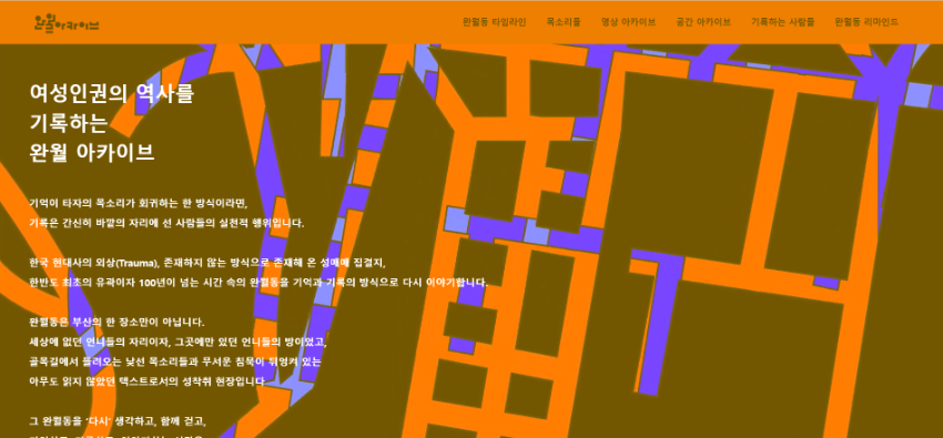 완월아카이브는 성착취 문제를 통해 여성인권의 역사를 기록하기 위해 만들어졌습니다. 그 이름은 대한민국에서 가장 오랫동안 여성을 착취해 온 완월동 성매매 집결지로부터 시작됩니다. 완월동은 100년을 훌쩍 넘는 시간 속에서 도시가 바뀌고 성장하는 동안에도 지도 위에 변함없는 모습으로 남아 있습니다. 완월 아카이브는, 성매매 집결지의 이름을 넘어 성착취 현장을 통해 여성인권의 가치를 일깨우는 새로운 공간으로 바꾸어나가기 위해 (사)여성인권지원센터'살림'과 완월 기록연구소가 함께 만들었습니다. 완월동 공간을 기록하는 일을 여성인권의 역사를 기록하는 일이며, 과거를 통해 미래를 배우는 길이기도 합니다. 완월아카이브는 부산형 인권 교육의 장인 동시에 세계 시민들이 이곳을 통해 여성인권의 역사를 배울 수 있는 장이 될 것입니다. (출처 : 완월아카이브 / http://wanwolwomen.co.kr)