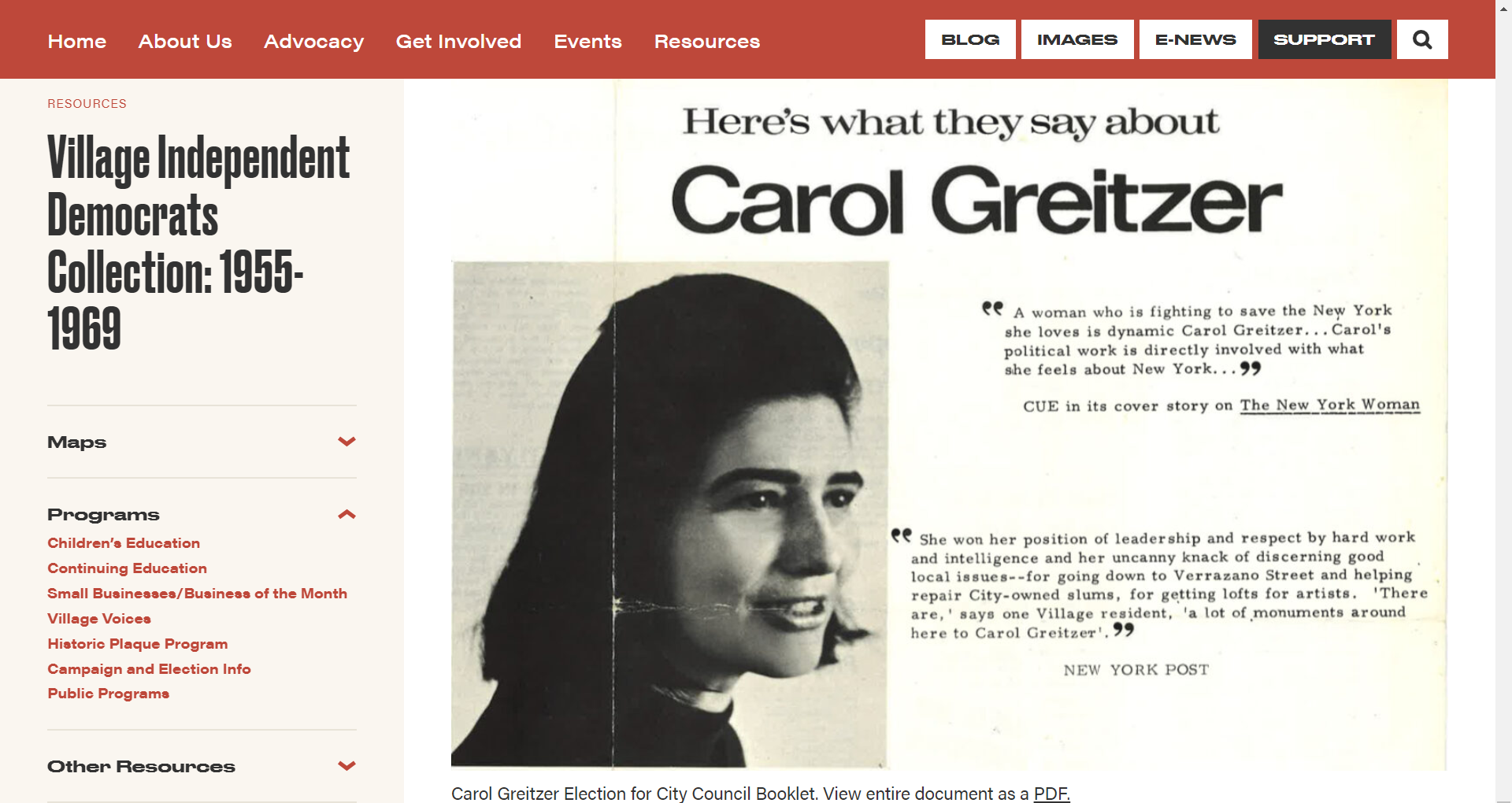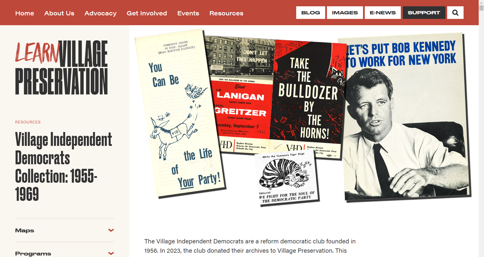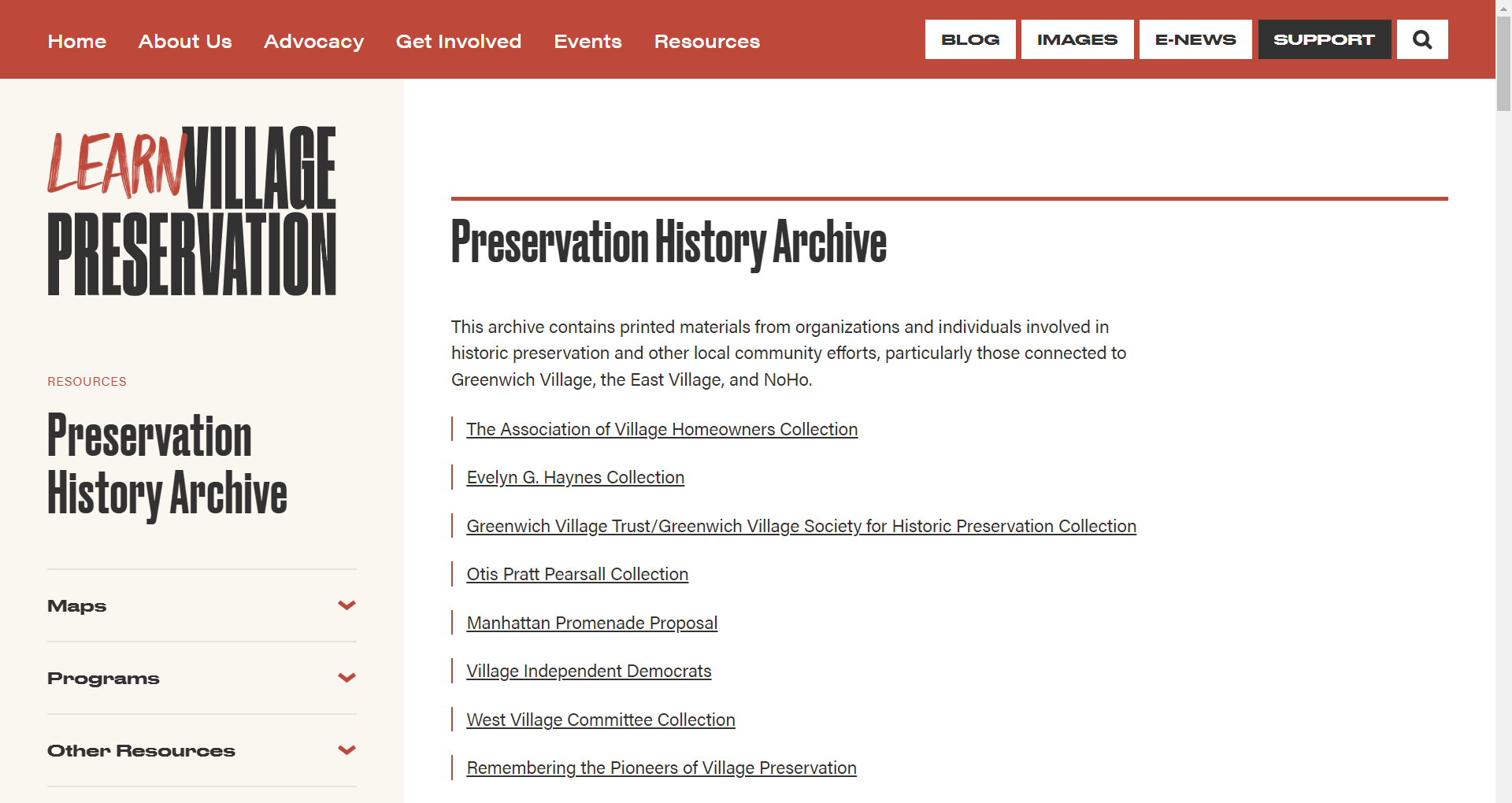 미국 뉴욕에 소재한 Village Preservation 에서 운영하는 아카이브입니다. Village Preservation은 1980년에 설립되었습니다. 이 아카이브는 지역, 공동체에 대한 역사를 보존하고 및 기타 지역 사회 노력에 관련된 조직과 개인들로부터 온 인쇄 자료를 수집하고 있습니다. 특히 그리니치 빌리지, 이스트 빌리지, 노호와 같은 지역과 연결된 활동에 초점을 맞추고 있습니다.