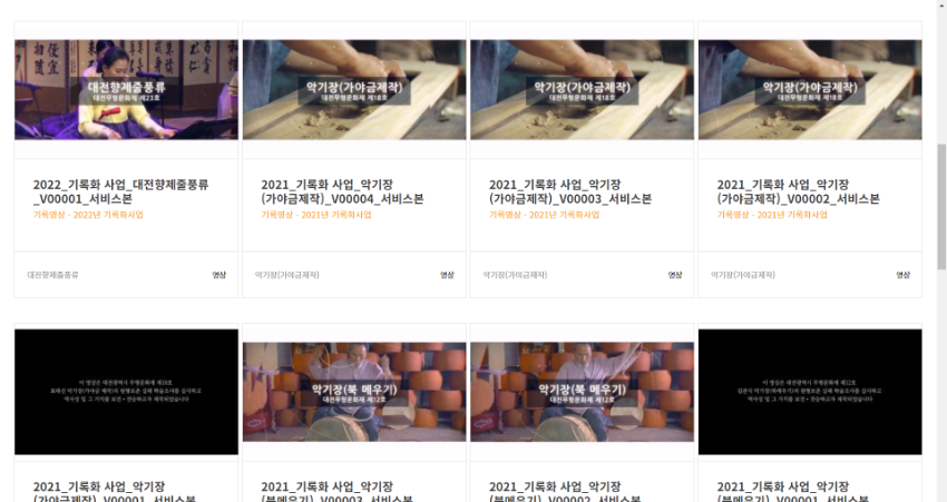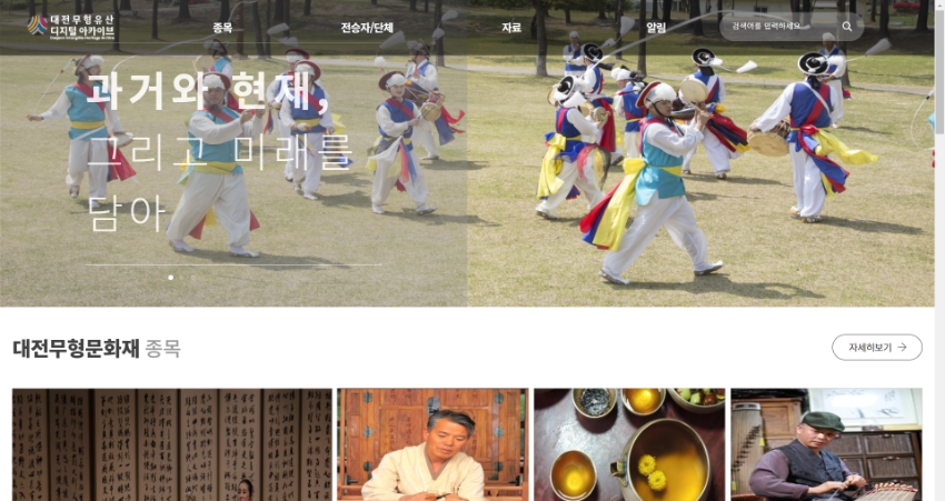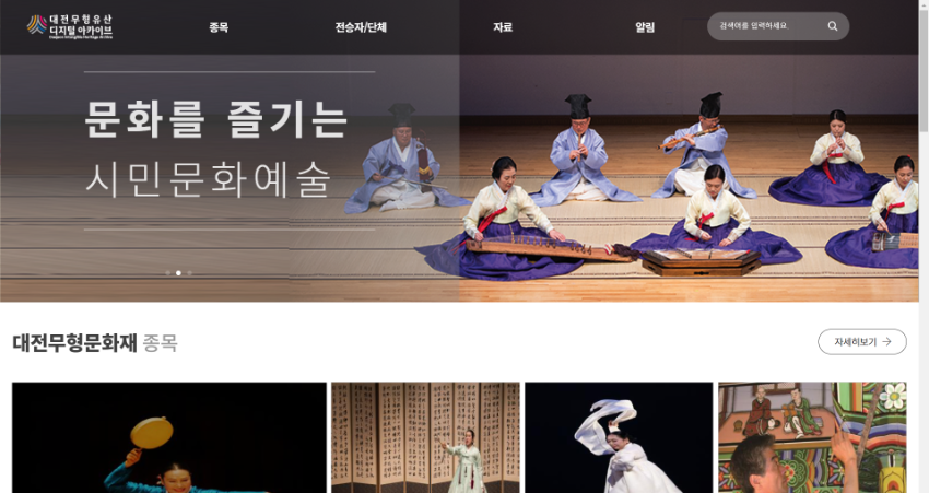 대전 무형유산 디지털 아카이브는 대전시 무형문화유산의 다양한 자료를 온라인 디지털 시스템으로 구축하여 보존하고 공유하는 대전문화재단의 서비스 플랫폼입니다. 대전문화재단에 따르면 전통나래관 개관 10주년을 기념해 '무형유산 디지털 아카이브' 를 2024년 2월 14일 구축하여 공개하였습니다. 대전 무형유산 디지털 아카이브에서는 대전시 무형문화유산과 관련된 기록화 자료, 연구 자료, 공연·전시·교육 자료 등 다양한 생산 자료와 무형문화재와 연구자 등에게 수집한 자료를 제공하고 있습니다.