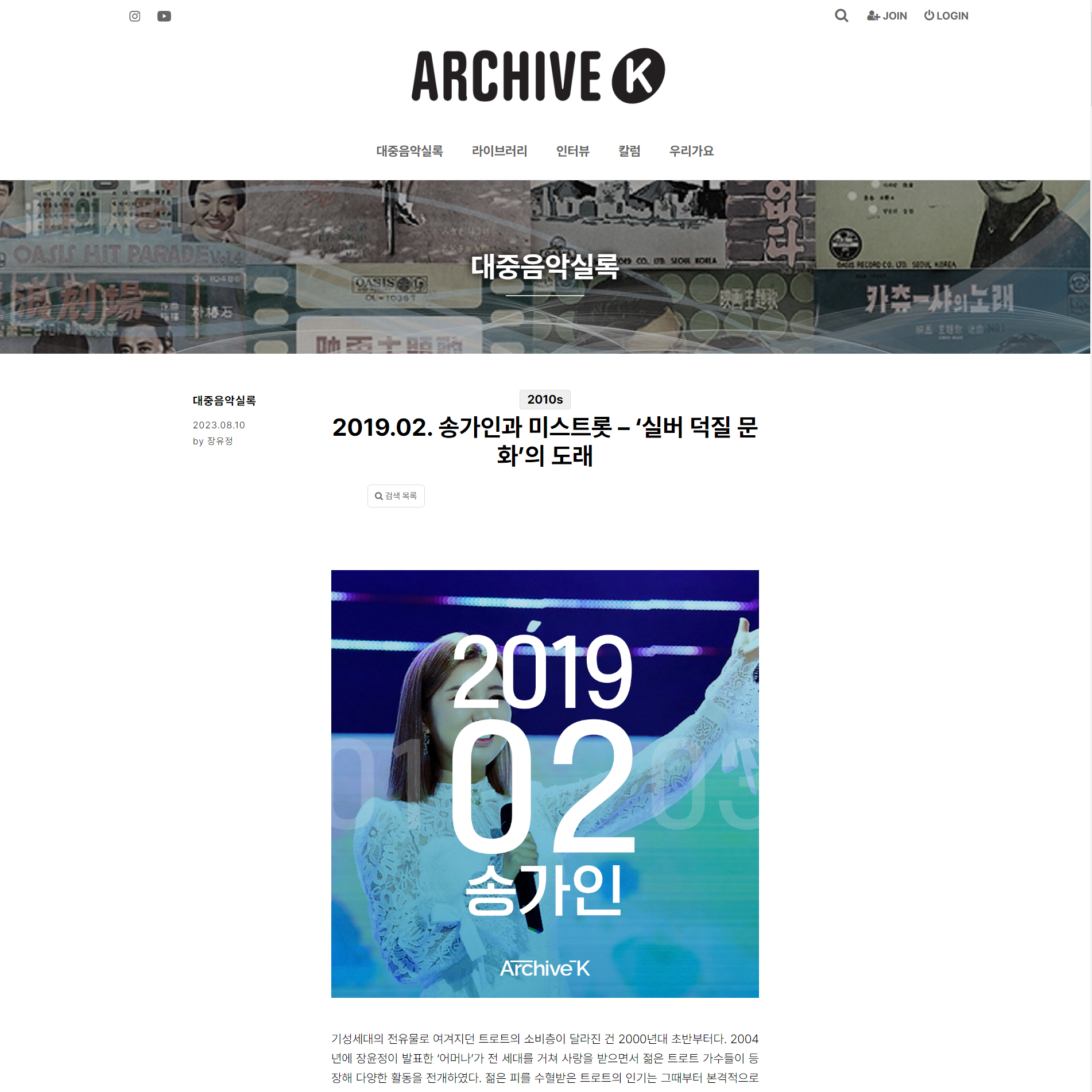 아카이브K는 한국 대중음악의 역사를 기록하는 아카이브입니다. 2021년 SBS에서 방송된 '전설의 무대 아카이브K' 프로그램에서는 K-POP으로 불리우는 대한민국의 대중음악 역사 속 주인공들의 기억과 의미 있는 자료를 보존(Archive)하고자 하였습니다. 명반이 나오기까지 주어진 상황과 환경 속에서 어떤 노력과 과정이 있었는지를 조명하였던 프로그램입니다. 주식회사 11018에서 운영하고 있는 아카이브K에서는 유튜브, 인스타그램 외에도 이 아카이브 플랫폼에서 대한민국 대중음악실록, 대중음악인 라이브러리, 인터뷰, 칼럽, 우리가요 등의 서비스를 제공합니다.