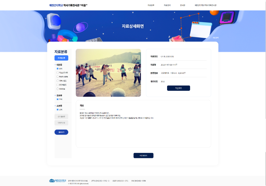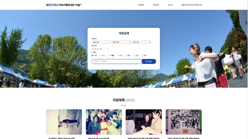 제천간디학교는 충북 제천시 덕산면 약초로 561(선고1리 92-3)에 위치한 비인가 대안학교입니다. 개교 25주년을 맞이하여 개교 이후의 문서, 사진, 영상, 음원 등의 자료를 디지털화하여 웹수장고 형태로 제공하고 있습니다. 대안교육과 간디학교에 관심을 갖고 있는 방문자들과 대한민국 대안교육을 연구자들을 위하여 전시관의 모든 자료는 무료로 열람하거나 다운로드 할 수 있습니다. 기록 전체 목록과 목록 내 검색 서비스, 주제별 컬렉션을 제공하고 있습니다.