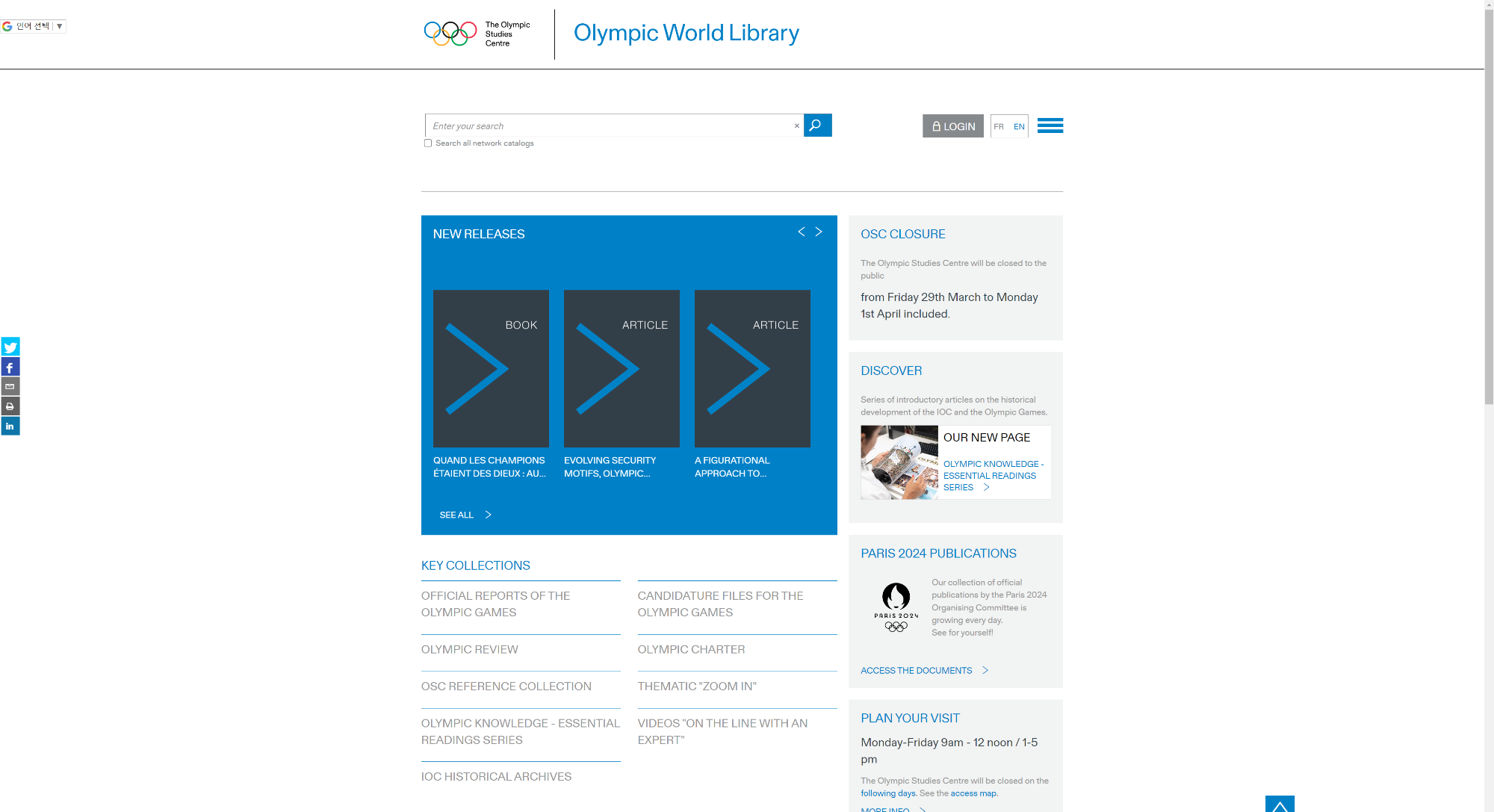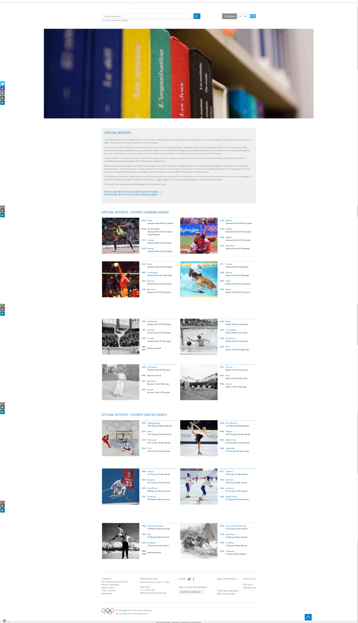 올림픽 월드 라이브러리는 올림픽과 관련된 지식이 원활하게 공유되고 전 세계 연구자들이 쉽게 접근할 수 있도록 IOC 위원회 산하의 올림픽 연구소에서 설립하였습니다. 이 아카이브를 통해 올림픽 연구 센터(Olympic Studies Centre)의 고유한 컬렉션과 전 세계의 학자 및 전문가가 제작한 출판물, 보도자료, 논문을 열람할 수 있습니다. 2024년 7월 개최를 앞둔 파리 하계올림픽 조직위원회의 간행물, 보도자료, 포스터를 포함하여 역대 올림픽의 공식 보고서도 온라인으로 확인할 수 있습니다. 다만 1992년 이전 올림픽 자료는 IOC 아카이브에 방문 예약을 한 뒤에 현장에서 이용이 가능합니다.