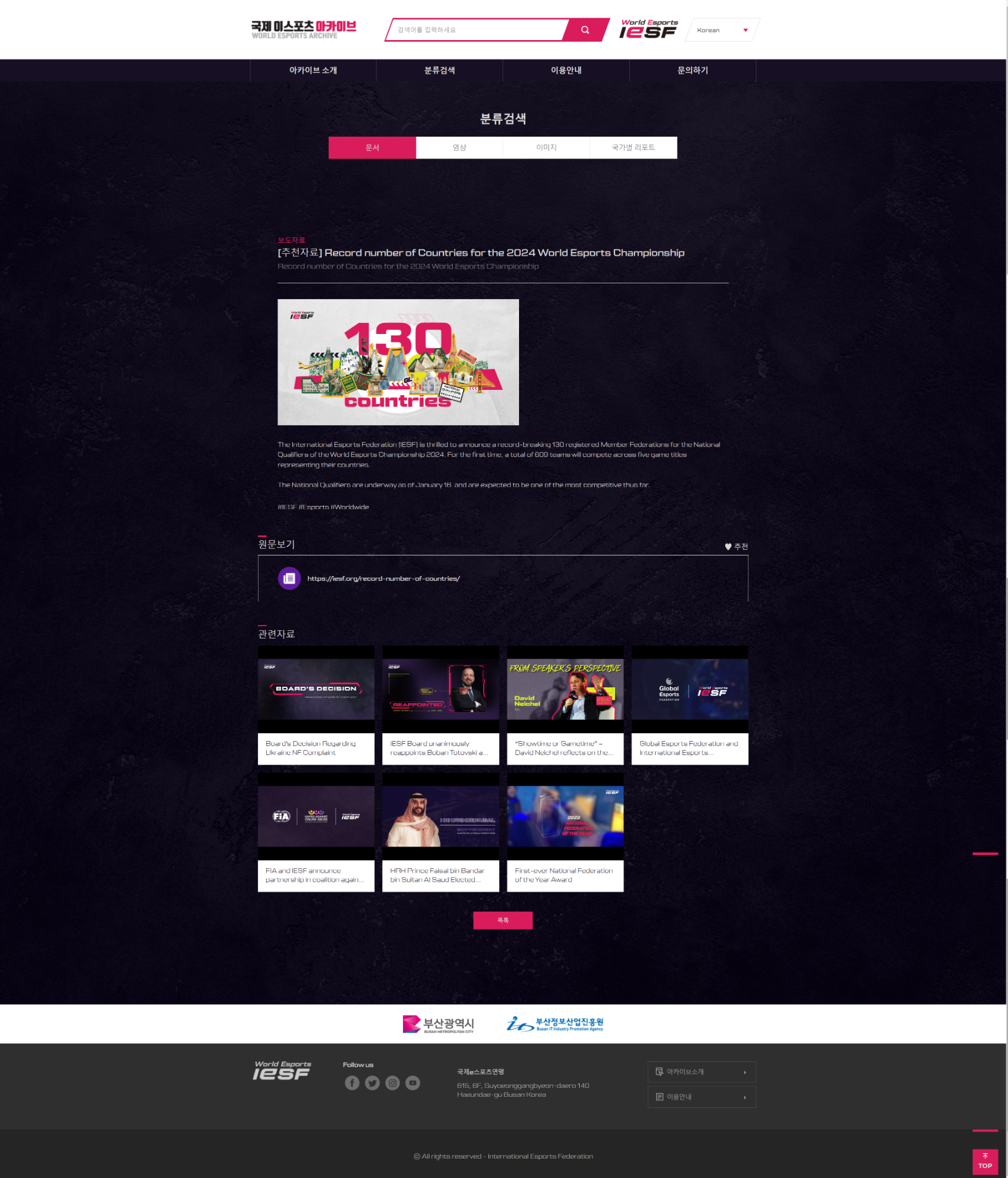 부산광역시와 부산정보산업진흥원에서 운영하는 국제이스포츠아카이브는 전 세계 이스포츠 연구 및 학술자료, 영상, 지식보고서를 수집하며 이스포츠 경기 및 통계자료들을 수집, 보관, 연구할 수 있는 이스포츠 연구 활동의 지식 플랫폼을 지향합니다. 리그오브레전드, 월드 챔피언십(IESF) 등의 연구보고서, 보도자료, 공식 행사, 학술대회 등의 이미지 및 영상, 문서를 제공하며 이용 시에 이용자 분석용으로 이용자 연령, 소속, 이용 목적에 관한 설문조사를 거치면 자유롭게 아카이브의 자료를 다운받을 수 있습니다.