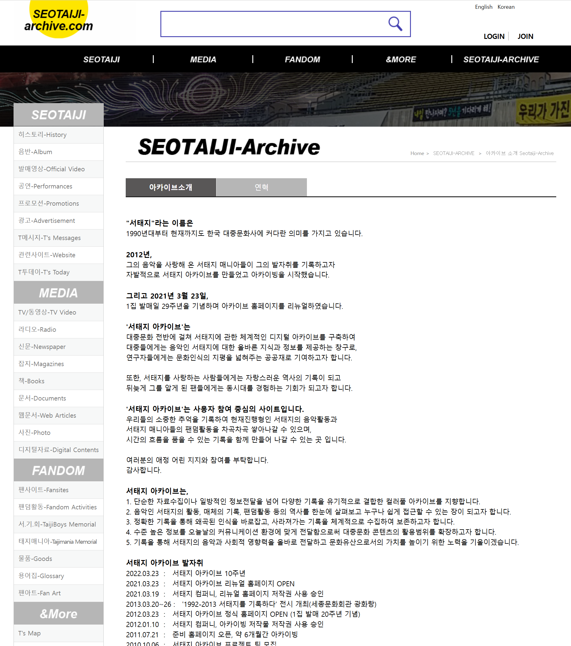 '서태지 아카이브'는 대중문화 전반에 걸쳐 서태지에 관한 체계적인 디지털 아카이브를 구축하여 대중들에게는 음악인 서태지에 대한 올바른 지식과 정보를 제공하는 창구로, 연구자들에게는 문화인식의 지평을 넓혀주는 공공재로 기여하고자 합니다. 또한, 서태지를 사랑하는 사람들에게는 자랑스러운 역사의 기록이 되고 뒤늦게 그를 알게 된 팬들에게는 동시대를 경험하는 기회가 되고자 합니다. 1990년대 서태지와 아이들의 데뷔부터 은퇴선언, 그 후 솔로 활동까지 서태지의 음악활동과 서태지 팬(서태지 매니아)들의 팬덤활동을 모아볼 수 있습니다.
