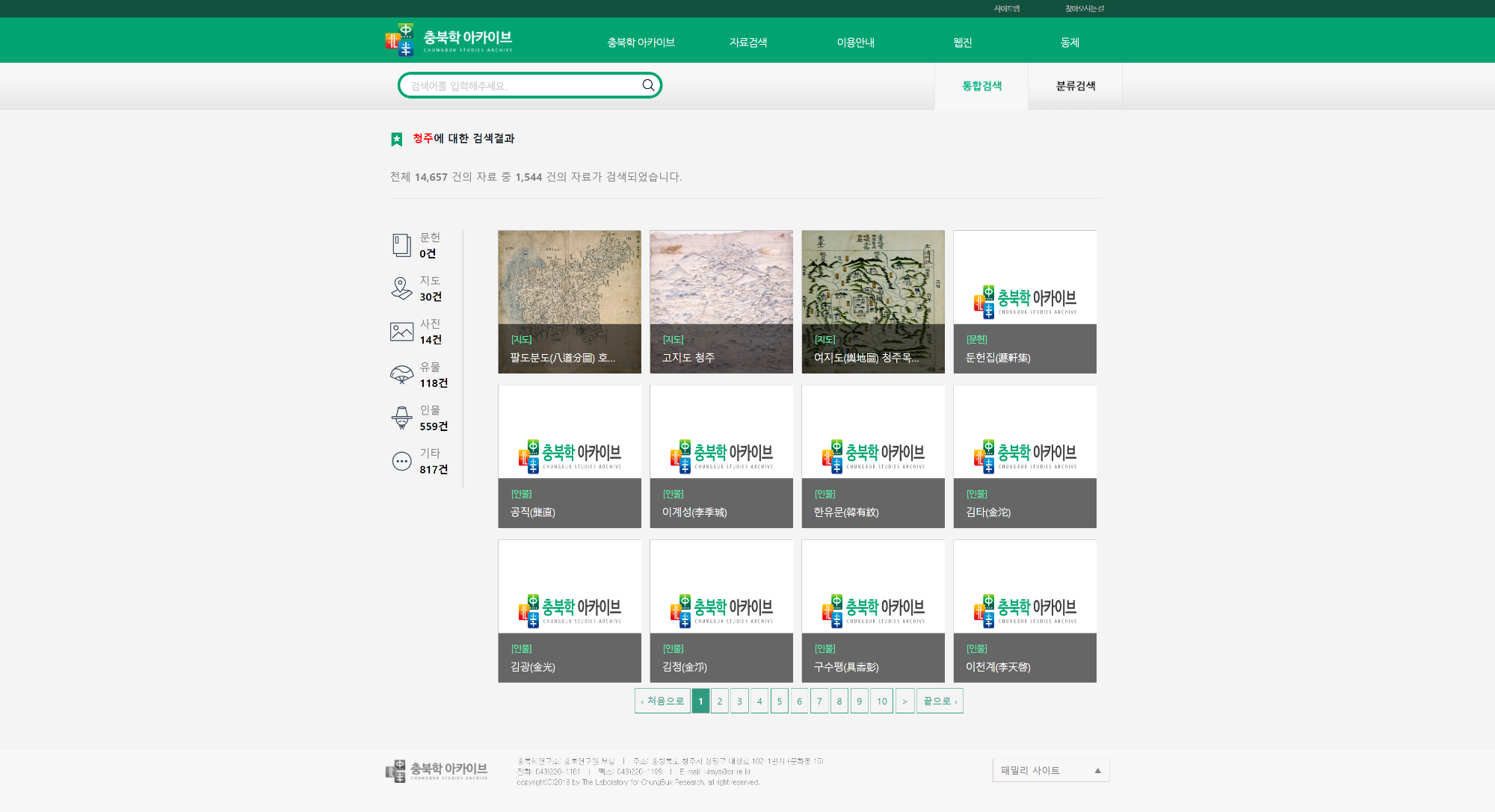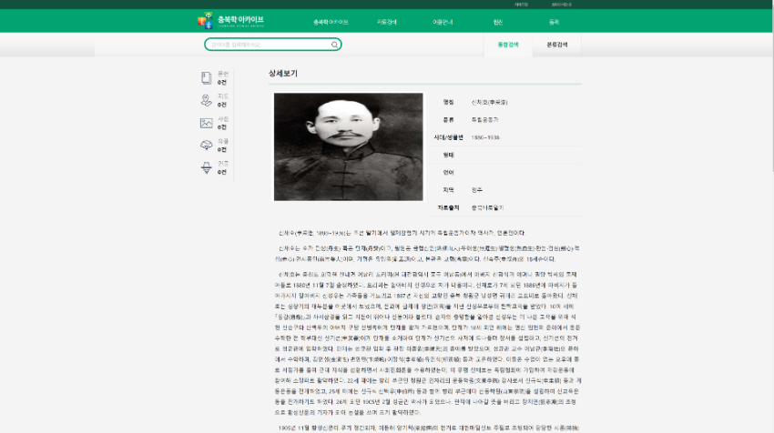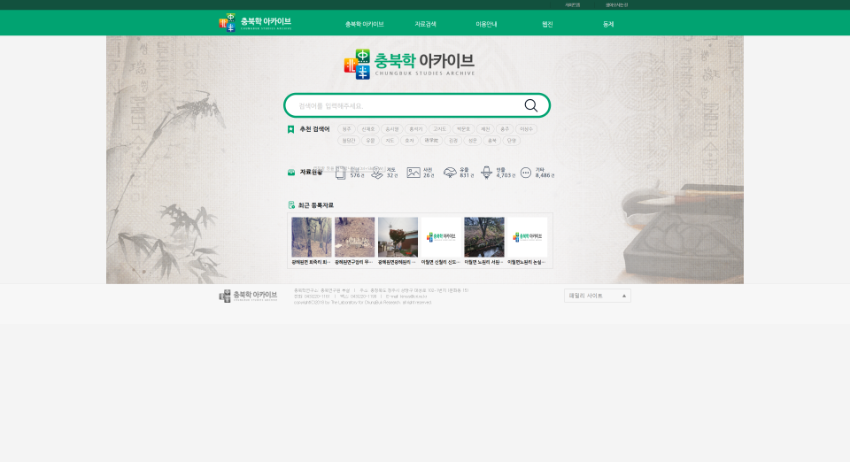 충북학 아카이브는 충북연구원 부설 충북학연구소에서 운영하고 있는 아카이브로서, 산재하고 있는 충북의 역사자료를 체계적으로 수집하여 DB화 시키고 정보제공 서비스를 통하여 많은 사람들이 충북의 역사를 접할 수 있는 공간입니다. 통합검색과 분류검색을 통하여 자료를 검색할 수 있습니다.