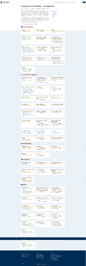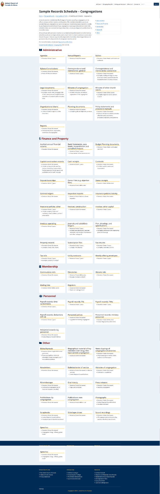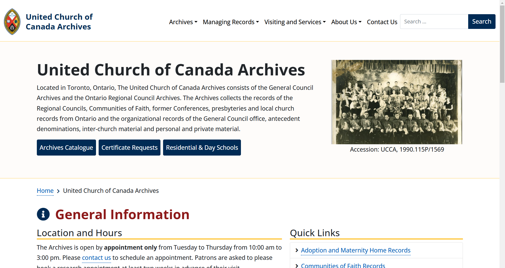 온타리오 주 토론토에 건물이 위치한 캐나다 연합 교회 기록 보관소는 총회 기록 보관소와 온타리오 지역 협의회 기록 보관소로 구성되어 있습니다. 기록 보관소는 지역 협의회, 신앙 공동체, 전 연회, 노회, 온타리오 지역 교회 기록의 기록과 총회 사무실, 선행 교단, 교회 간 자료, 개인 및 사적 자료의 조직 기록을 수집합니다. 1952년에 공식 출범한 캐나다 온타리오 지역 협의회 기록 보관소로 장로교, 감리교, 복음주의 등 여러 교단과 관련된 역사를 수집, 보존하여 제공합니다.